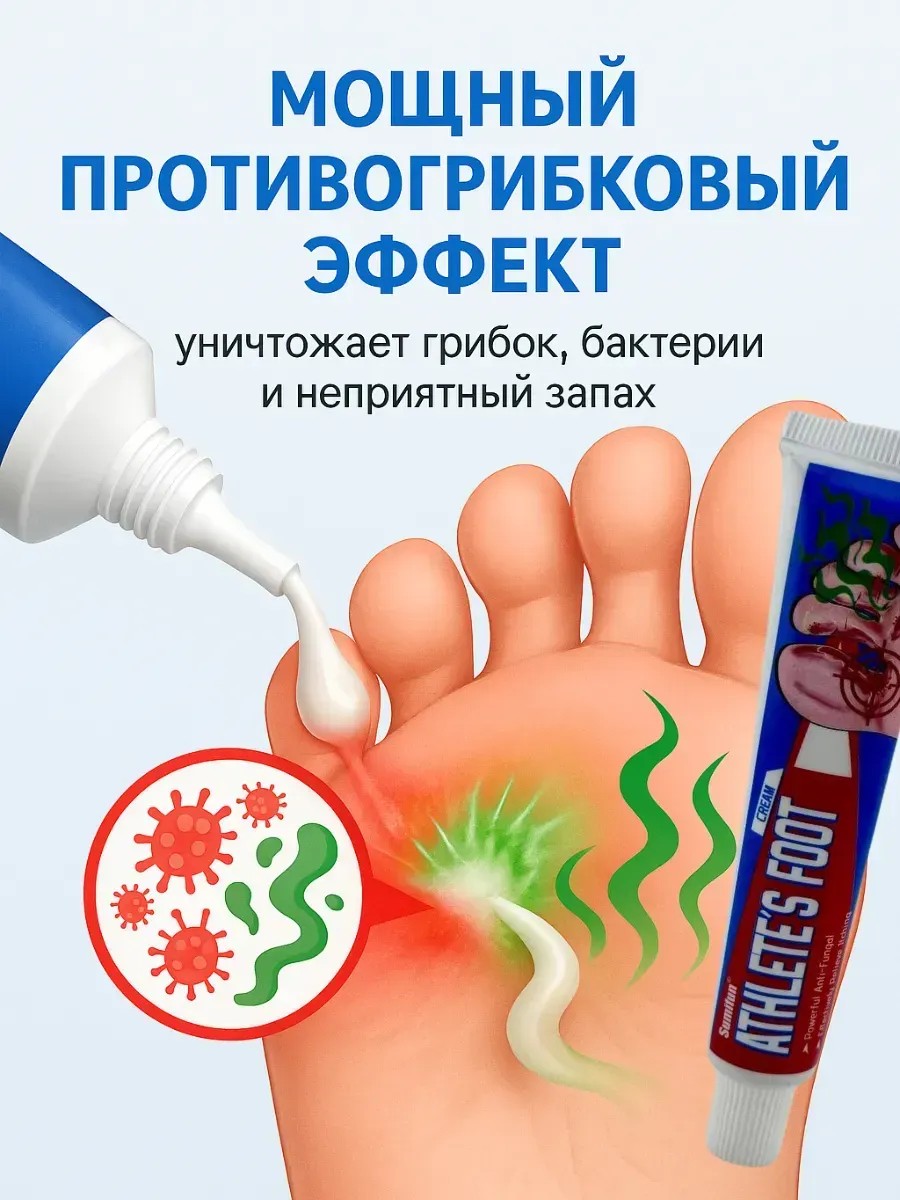 Hello! This effective foot fungus cream helps quickly eliminate unpleasant symptoms and restore healthy skin. It gently cares for your feet, eliminates flaking, softens rough areas, and accelerates healing.
