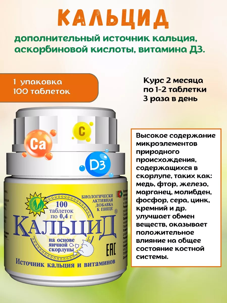 Кальцид в таблетках содержит органический кальций и витамины D и С. Эти компоненты необходимы для правильного роста, развития и поддержания здоровья костей и зубов. Средство получают путем обработки яичной скорлупы, используя современные биотехнологии и сохраняя полностью естественный набор микроэлементов, содержащийся в скорлупе, с дополнительным введением витаминов. Витаминно минеральный комплекс эффективно восполняет дефицит кальция, препятствует развитию остеопороза улучшает состояние зубов и ногтей повышает иммунитет к простудным заболевания, положительно влияет на кроветворную функцию. Кальцид получают путем обработки яичной скорлупы, используя современные биотехнологии и сохраняя полностью естественный набор микроэлементов, содержащийся в скорлупе, с дополнительным введением витаминов.