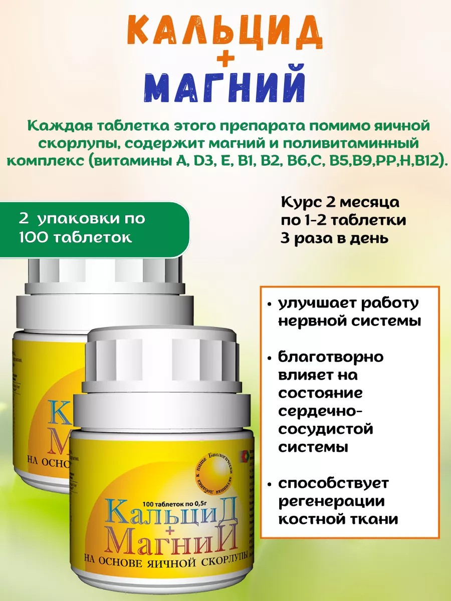 Кальций-магний – это биологически активная добавка к пище (БАД), содержащая в себе два важных минерала для поддержания здоровья костей и нервной системы. В упаковке 100 штук таблеток, каждая из которых содержит необходимую дневную дозу кальция и магния. Препарат рекомендуется принимать взрослым и детям старше 12 лет по одной таблетке три раза в день во время еды. Средство не является заменой полноценного питания, а лишь дополнением к нему для поддержания здоровья организма. Перед применением препарата необходимо проконсультироваться с врачом, особенно если у вас есть проблемы со здоровьем или вы принимаете другие лекарства. КальциД + Магний — общеукрепляющий минерально-витаминный комплекс на основе яичной скорлупы. Усиленная формула препарата «КальциД»