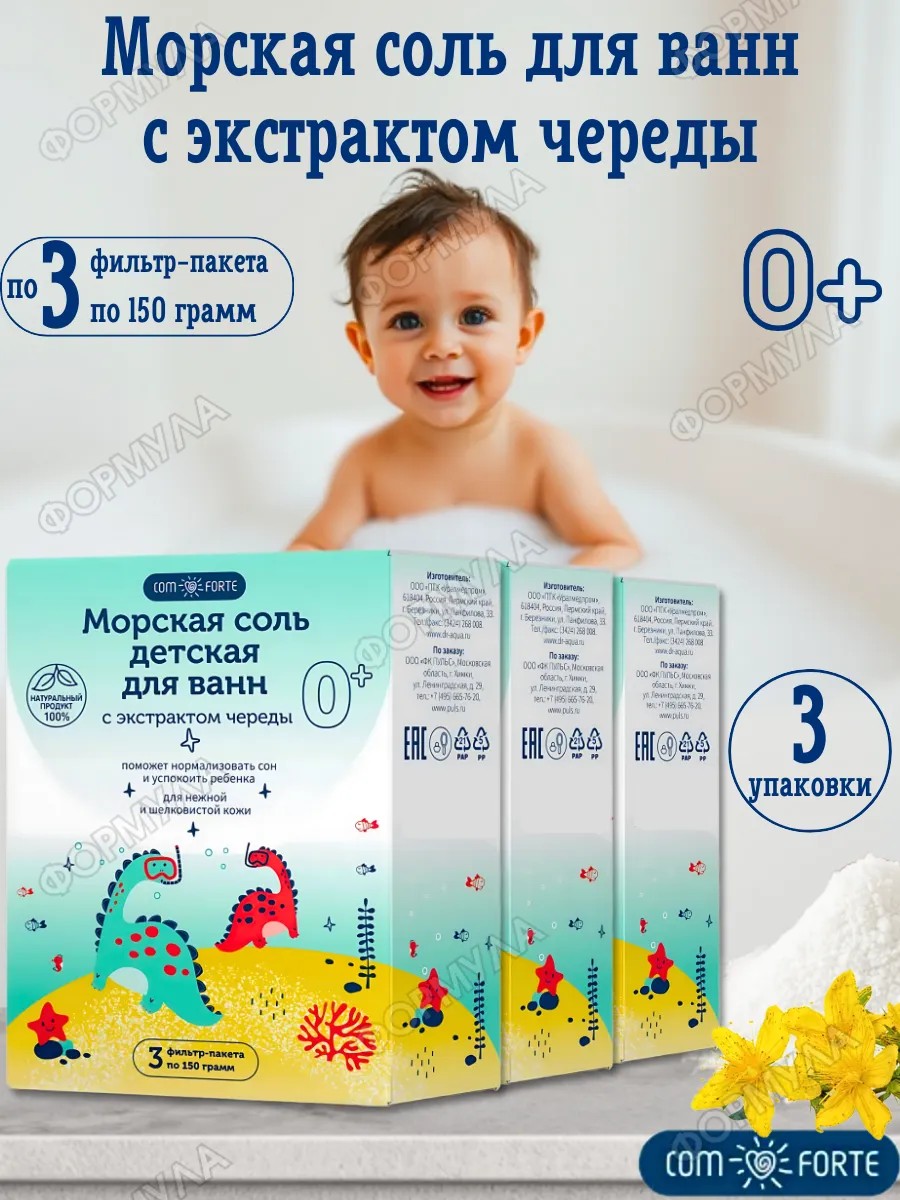 | Комплектация | Соль д/ванн детская 0+ ComForte (с экстр. череды) ф/п 150 г х3 ПУЛЬС*3шт |