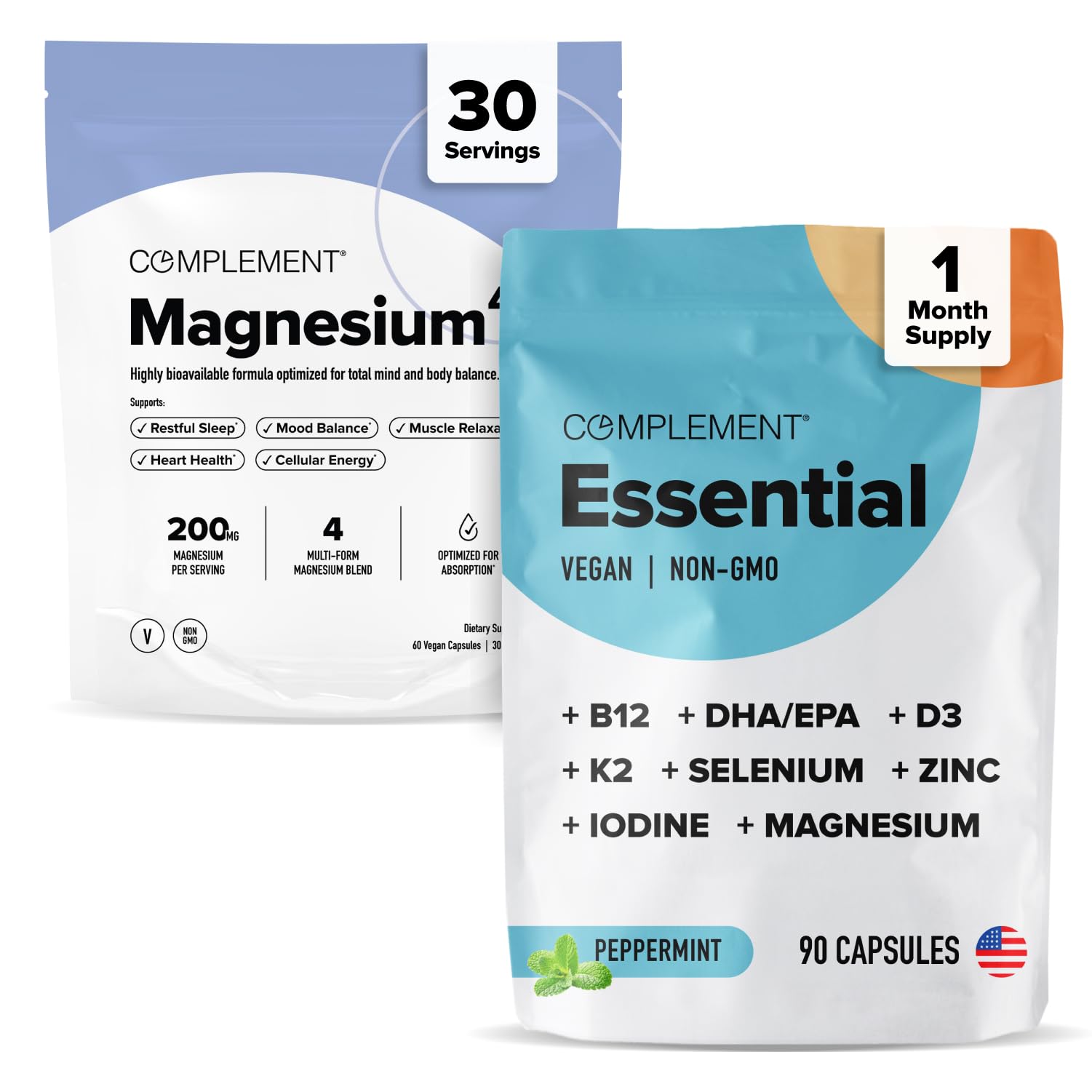 Boost your daily health and vitality with the Complement Essential Magnesium Bundle. Combining Complement Essential, a comprehensive vegan multivitamin designed to fill nutritional gaps, with Complement Magnesium, a potent formula for stress relief and muscle recovery, this bundle is the perfect addition to any plant-based lifestyle. Whether you're looking to support your immunity, enhance energy, improve cognitive function, or recover after workouts, this duo has you covered with clean, vegan-friendly ingredients. Feel your best, naturally.Clean, Vegan, and Eco-Conscious Formula - Both products are free from GMOs, allergens, and artificial fillers. Eco-friendly packaging ensures you're taking care of your health while being kind to the planet. Supports Energy, Immunity Overall Vitality - This bundle works synergistically to enhance daily energy levels, support a healthy immune system, and promote overall vitality—perfect for those with an active, plant-based lifestyle. Mental Clarity Cognitive Support - Omega-3 DHA EPA in Complement Essential supports brain function, mental clarity, and reduces brain fog, while Magnesium Bisglycinate helps to regulate neurotransmitters and reduce stress for improved cognitive health. Enhanced Muscle Recovery Stress Relief - The Complement Magnesium features 4 highly bioavailable forms of magnesium for optimal absorption—helping to reduce muscle soreness, fatigue, and support deep relaxation and sleep. Complete Vegan Multivitamin for Overall Health - The Complement Essential Multivitamin provides 8 essential nutrients often lacking in plant-based diets, including Omega-3 DHA EPA, Vitamin B12, Vitamin D3 K2, and Magnesium to support immunity, energy, and vitality.