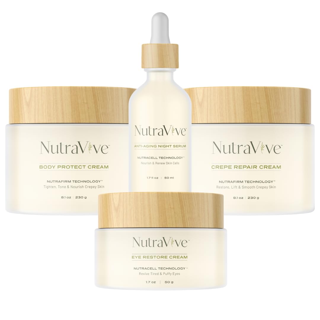 60-DAY SATISFACTION PROMISE BY NUTRAVIVE: We have complete confidence in the quality and effectiveness of our products. Our unconditional 60-day satisfaction promise means that NutraVive offers a satisfaction guarantee if you're not completely satisfied. Your happiness is our top priority. CUTTING EDGE PEPTIDES APPLE STEM CELLS: NutraFirm is a proprietary blend of Science Backed Peptides, Apple Stem Cells, Hyaluronic Acid, Coconut Oil, Collagen and much more. These potent ingredients have been perfectly balanced to help boost natural collagen production for improved skin elasticity, and to promote anti-aging and rapid skin repair and radiance for a more youthful appearance. REVIVE TIRED PUFFY EYES: Our indulgent eye repair cream harnesses the power of peptides to tackle under eye puffiness by tightening sagging under eye skin and fine lines and wrinkles around eyes for a smoother, younger looking complexion using natural healthy ingredients. ANTI-AGING NIGHT SERUM: Embrace a youthful, glowing complexion each morning with our anti-aging night facial serum. Our overnight skin transformation formula reduces fine lines and wrinkles and boosts skin layer elasticity using healthy natural ingredients. COMBAT CREPEY SKIN: Our Crepe Body Protect Cream and Crepe Repair Cream are meticulously crafted to target the delicate areas of loose skin that are prone to thinning and wrinkling, thus restoring a smooth and radiant complexion using healthy natural ingredients.