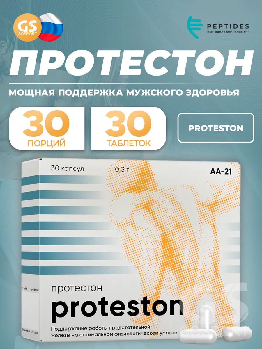 Expires until August 31, 2025. Proteston peptide complex, 30 capsules. Proteston is a multi-component peptide supplement for men's health, created at the intersection of peptide and non-peptide bioregulators. It normalizes the male reproductive system, improves vascular elasticity, and enhances sexual performance. It also slows the growth of prostate adenoma. It promotes increased performance and is effective in treating mental and physical fatigue and arterial hypotension. Proteston activates energy and metabolic processes in the body. Restores and normalizes the immune, neuroendocrine and reproductive systems of the male body, improves the functioning of the prostate gland. The combination of a dipeptide that stimulates the functions of the male reproductive system and the most valuable active ingredients - extracts of reindeer antlers, hemolen, pygeum bark, zinc and selenium helps prevent aging and allows you to effectively correct the functioning of the male genitourinary system. Recommended: • to normalize the male genitourinary system • erectile dysfunction • for a moderate increase in testosterone • prostate adenoma • chronic congestive prostatitis • premature ejaculation • decreased quality of ejaculate • decreased libido • to maintain the immune system • to improve mental and physical activity Product composition MCC (carrier), L-arginine, brewer's yeast enriched with selenium, pygeum bark extract, zinc citrate, epimedium extract, lactose (filler), Hemolen, calcium stearate (anti-caking agent), silicon dioxide (anti-caking agent), pantel, peptide complex AA-21 (a dipeptide consisting of L-glutamic acid and L-lysine).Directions for use: Adults take 1 tablet daily with meals. Duration of treatment: 4-6 weeks. If necessary, the course can be repeated. Repeat treatments are possible throughout the year.Main components: AA-21 (a dipeptide consisting of L-glutamic acid and L-lysine) - Restores the functioning of a number of systems in the male body. Normalizes metabolism, changing the functional state of the nervous and endocrine systems. Has a selective effect on the cells of the male reproductive system and improves the functioning of the prostate gland.L-lysine - An essential basic aliphatic amino acid. It catalyzes enzymatic conversion processes, participates in protein and carbohydrate metabolism, reduces serum triglyceride levels, promotes calcium absorption and maintains nitrogen balance in adults, participates in the production of antibodies, hormones, and enzymes, strengthens immunity to viral infections, promotes collagen formation, and promotes tissue repair. Lysine helps prevent osteoporosis and cataracts, maintain muscle tissue, and relieve stress. Together with vitamin C, it participates in the formation of carnitine. L-glutamic acid is a replaceable amino acid, but is essential for some tissues of the human body. It regulates metabolic processes in the central nervous system and has nootropic, detoxifying, and ammonia-binding effects. It also participates in oxidative processes in brain cells to produce energy (ATP), promotes serotonin synthesis, increases muscle permeability to potassium ions, and is involved in the synthesis of enzymes (NAD), c-AMP, and c-GMP. L-arginine is an amino acid that maintains optimal blood cholesterol levels and has a positive effect on vascular health and heart function. Furthermore, this amino acid stimulates insulin production, reduces fat deposits, stimulates growth hormone synthesis, and accelerates wound healing. Brewer's yeast, enriched with selenium, has a beneficial effect on the liver, optimizing its function in various acute and chronic diseases. Furthermore, this combination of components prolongs youth, prevents the formation of cancer cells, and strengthens the immune system. Yeast improves digestion, activates intestinal transport functions, normalizes metabolic processes, has an immunostimulatory and detoxifying effect, and promotes the elimination of toxic substances. Pantel (reindeer antler extract) - Reindeer antler extract has been known since ancient times for its ability to slow the aging process. Antlers improve brain function, activating memory, attention, and sharpening vision. They maintain male potency into old age. Reindeer antler extract has tonic properties; its use is indicated for physical and mental fatigue, n