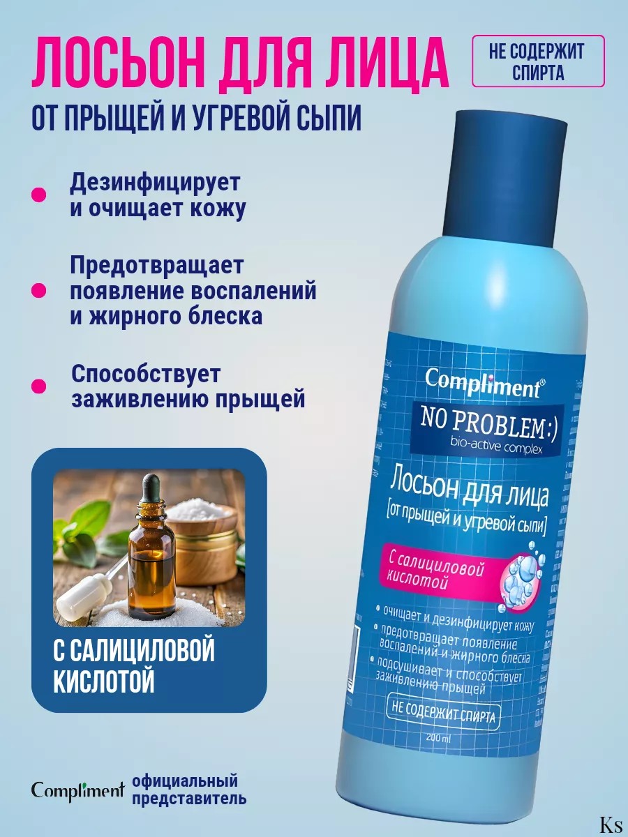 Compliment No Problem Acne and Pimple Lotion with salicylic acid deeply cleanses pores, dries inflamed areas, and promotes healing. It has antibacterial and anti-inflammatory properties, heals and evens out the skin's surface, and prevents shine. Leaves skin feeling fresh and clean without irritation or dryness.