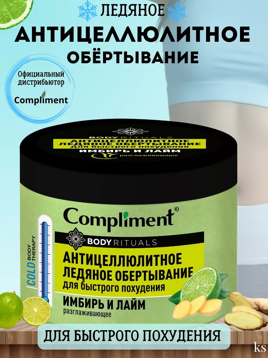 Антицеллюлитное Ледяное обертывание Compliment BODY RITUALS Имбирь и лайм. Криообертывание усиливает отток лимфы из тканей, что способствует снятию отечности, улучшает микроциркуляцию, выводит лишнюю жидкость из организма. Воздействие холода стимулирует процессы регенерации в тканях, благодаря чему повышается тонус кожи. Кожа становится подтянутой и упругой. Кроме того, для согревания, организм начинает активно расщеплять жиры. Благодаря усиленному теплообмену, криотерапия способствует потере веса и избавлению от целлюлита.
