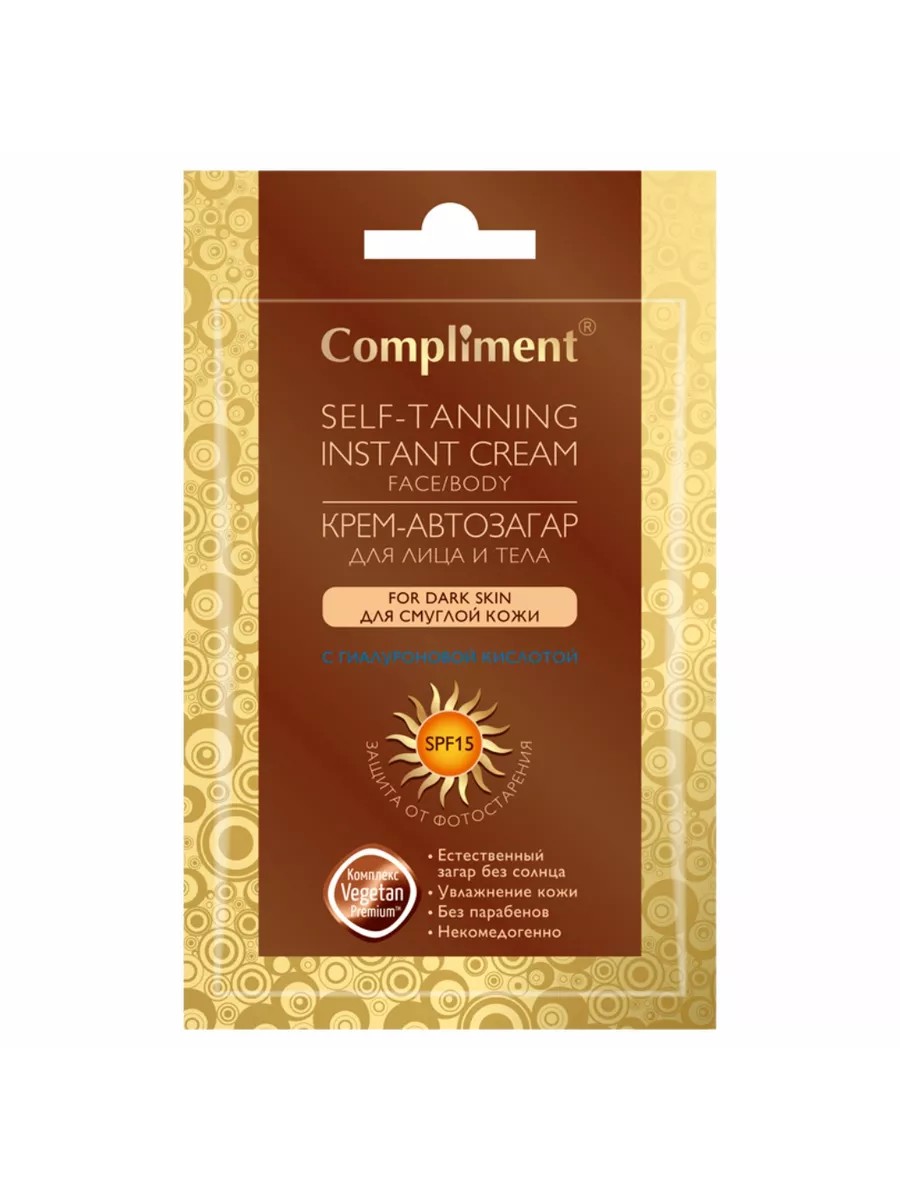 Compliment крем автозагар для тела и лица для смуглой кожи SPF 15+ (СПФ 15+) 15мл. С гиалуроновой кислотой. Комплекс Vegetan Premium уже после первого применения придает коже естественный оттенок загара, не нанося ей вреда в отличие от солнца и соляриев. Комбинация активных компонентов создает глубокий стойкий оттенок без эффекта желтизны. Мягкая нежирная консистенция крема легко и быстро впитывается, обеспечивая равномерный загар без пятен и полос. Формула крема обогащена гиалуроновой кислотой, которая способствует активному увлажнению, защищая кожу от сухости и улучшая стойкость полученного оттенка. Оттенок крема адаптирован для создания эффекта естественного загара на светлой коже. Использование на уже загоревшей коже (после солнца или солярия) укрепляет и улучшает стойкость загара. Не оставляет следов на одежде. Преимущества автозагара! БЫСТРЫЙ загар. Оттенок становится виден уже через час. БЕЗОПАСНЫЙ загар. Крем содержит 100% натуральный дигидроксиацетон и эритрулозу, которые воздействуют только на верхний слой кожи, не повреждая ее и не проникая внутрь. РОВНЫЙ загар. Никаких разводов и пятен на коже. СТОЙКИЙ загар. Оттенок держится от 5 до 10 дней. КРУГЛОГОДИЧНЫЙ загар. В любое время по Вашему желанию. ПРОФЕССИОНАЛЬНЫЙ загар. Рецептура средства основана на новейших достижениях профессионалов в области автозагаров.