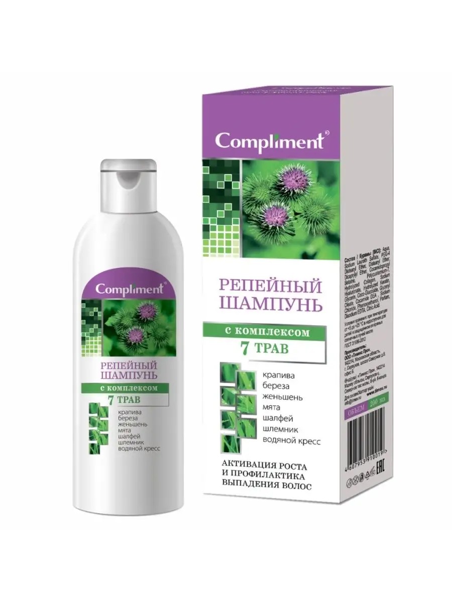 Compliment Репейная серия Репейный шампунь с комплексом 7 трав 200мл. Шампунь для волос Комплимент помогает ухаживать за волосами, склонными к выпадению, активно влияя на процессы регенерации и ускорения роста волос посредством фито-компонентов. Входящий в состав растительный комплекс на экстрактах трав улучшает кровообращение и обмен веществ в прикорневой зоне, питает волосяные луковицы. Его действие стимулирует процессы роста новых волос, смягчая и очищая кожу головы от омертвевших клеток. В результате ускоряется рост волос, заметно улучшается их структура, волосы выглядят более плотными и здоровыми. При использовании шампуня регулярно волосы становятся более сильными, активизируется их рост, улучшается густота и эластичность. Шлемник байкальский и шалфей – природные стимуляторы роста волос, усиливают кровоснабжение клеток кожи головы, препятствуя чрезмерному выпадению волос. Корень женьшеня способствует активизации всех процессов на клеточном уровне: значительно укрепляет волосяные фолликулы, снижает темпы выпадения волос и улучшает их рост. Олигопептиды стимулируют рост волос, замедляют их выпадение, омолаживают кожу головы, повышают эластичность, защищают от неблагоприятных факторов внешней среды. Д-пантенол проникает внутрь волоса, обволакивая его эластичной пленкой снаружи и утолщая, придает волосам гибкость, эластичность и блеск. Помогает усилить циркуляцию крови, способствуя лучшему питанию волос. Репейник усиливает обменные процессы в волосяном фолликуле, стимулирует обновление и укрепление кератинового слоя волос. Водяной кресс прекрасно стимулирует рост волос за счет наличия в растениях серосодержащего эфирного масла, помогает предупредить появление и устранить перхоть.Белая крапива способствует себорегуляции, придает силу волосяным фолликулам, улучшает циркуляцию крови, предотвращает выпадение волос. Береза стимулирует появление новых волос, имеет тонизирующее действие.Мята оказывает очищающее и укрепляющее действие, стимулирует подкожное кровообращение