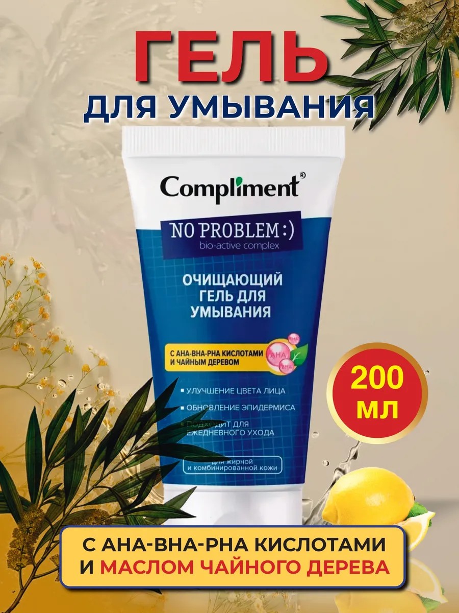 Комплимент No problem Очищающий гель для умывания, с АНА-ВНА-РНА кислотами и маслом чайного дерева, 200мл.