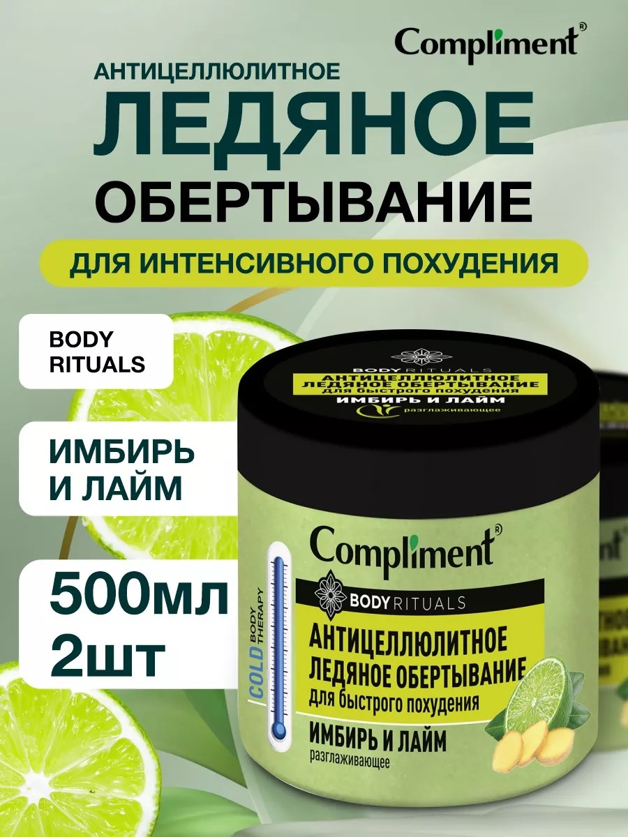 Compliment Body Rituals Anti-Cellulite Ice Wrap Ginger and Lime 500ml*2 pcs. Cryo-wrap enhances lymphatic drainage, which helps reduce swelling, improves microcirculation, and removes excess fluid from the body. Cold exposure stimulates tissue regeneration processes, improving skin tone. The skin becomes firm and elastic. In addition, to maintain warmth, the body begins to actively break down fat. Thanks to enhanced heat exchange, cryotherapy promotes weight loss and cellulite reduction. Ginger root extract stimulates circulation, activates drainage and detoxification, and tones the skin in the treated area. Lime extract accelerates circumference reduction, evens out the skin's surface, eliminating the appearance of orange peel. Directions: Apply a thick layer to the treatment area, cover with plastic wrap and a warm blanket, and wait 15-20 minutes. Rinse off any remaining product with warm water without soap. Exposure to heat activates the release and absorption of the product's active ingredients, increasing its effectiveness. Active ingredients: Menthol; Ginger root extract; Arctic algae; Lime extract; Horse chestnut. Contraindications: Individual intolerance to any of the product's components. Not recommended for use in the presence of varicose veins, or during pregnancy or lactation. Consult a physician for any other contraindications. Ingredients: Aqua, Glycerin, Caffeine, Troxerutin, Fucus Vesiculosus Extract, Laminaria Saccharina Extract, Zingiber Officinale Extract, Aesculus Hippocastanum Fruit Extract, Citrus Aurantifolia (Lime) Fruit Extract, Camellia Sinensis Leaf Extract, Phenoxyethanol, Menthol, Caprylic/Capric Triglyceride, PEG-40 Hydrogenated Castor Oil, Acrylates/C10-30 Alkyl Acrylate Crosspolymer, Triethanolamine, Parfum, Disodium EDTA.
