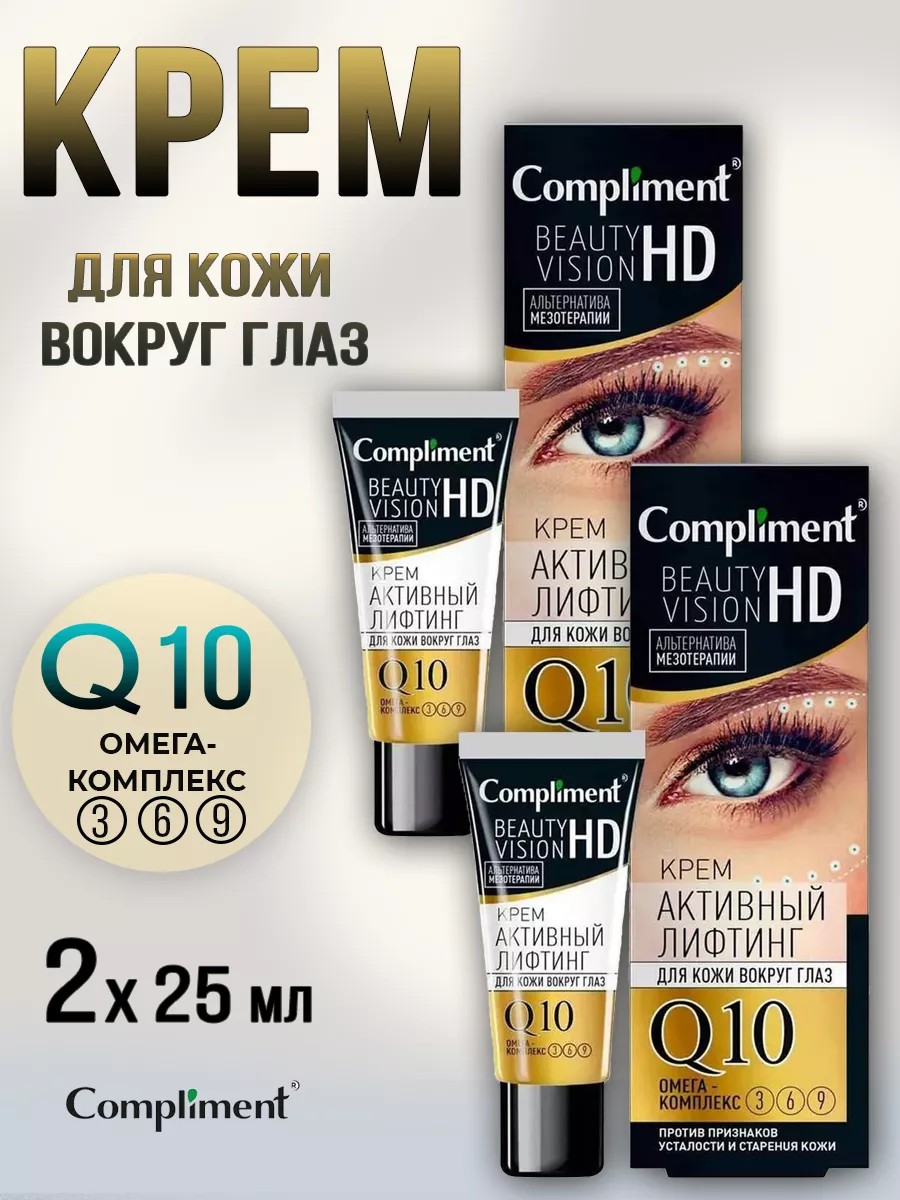 Compliment Beauty Vision HD Крем Активный лифтинг для кожи вокруг глаз 25 мл, 2 шт. Средство, созданное по технологии нового поколения, позволяющей продукту постепенно раскрываться на коже, высвобождая активные компоненты пролонгировано, обеспечивая видимый эффект на более длительное время.Благодаря высококонцентрированной формуле с незаменимыми жирными кислотами, крем укрепляет кожу и делает ее более плотной, снижает глубину выраженности морщин, питает и увлажняет. Уменьшает проявления стресса, воздействия внешних факторов, истончения и обезвоженности кожи. Облагает антиоксидантным действием, способствуя восстановлению защитных свойств кожи.Коэнзим Q10 является эффективным источником энергии для клеток и активно способствует регенерации и замедлению процессов естественного старения. Снижает выраженность воспалительных процессов на коже, борется с мимическими и возрастными морщинами. Основные действия:•снимает отечность верхних и нижних век•снижает проявления возрастных изменений, признаков усталости и стресса•предупреждает образование глубоких морщин •возвращает упругость и подтянутость коже век.Активные ингредиенты: Q10, омега комплекс 3—6 - 9.___Применение: ежедневно утром и вечером наносить на очищенную кожу вокруг глаз.