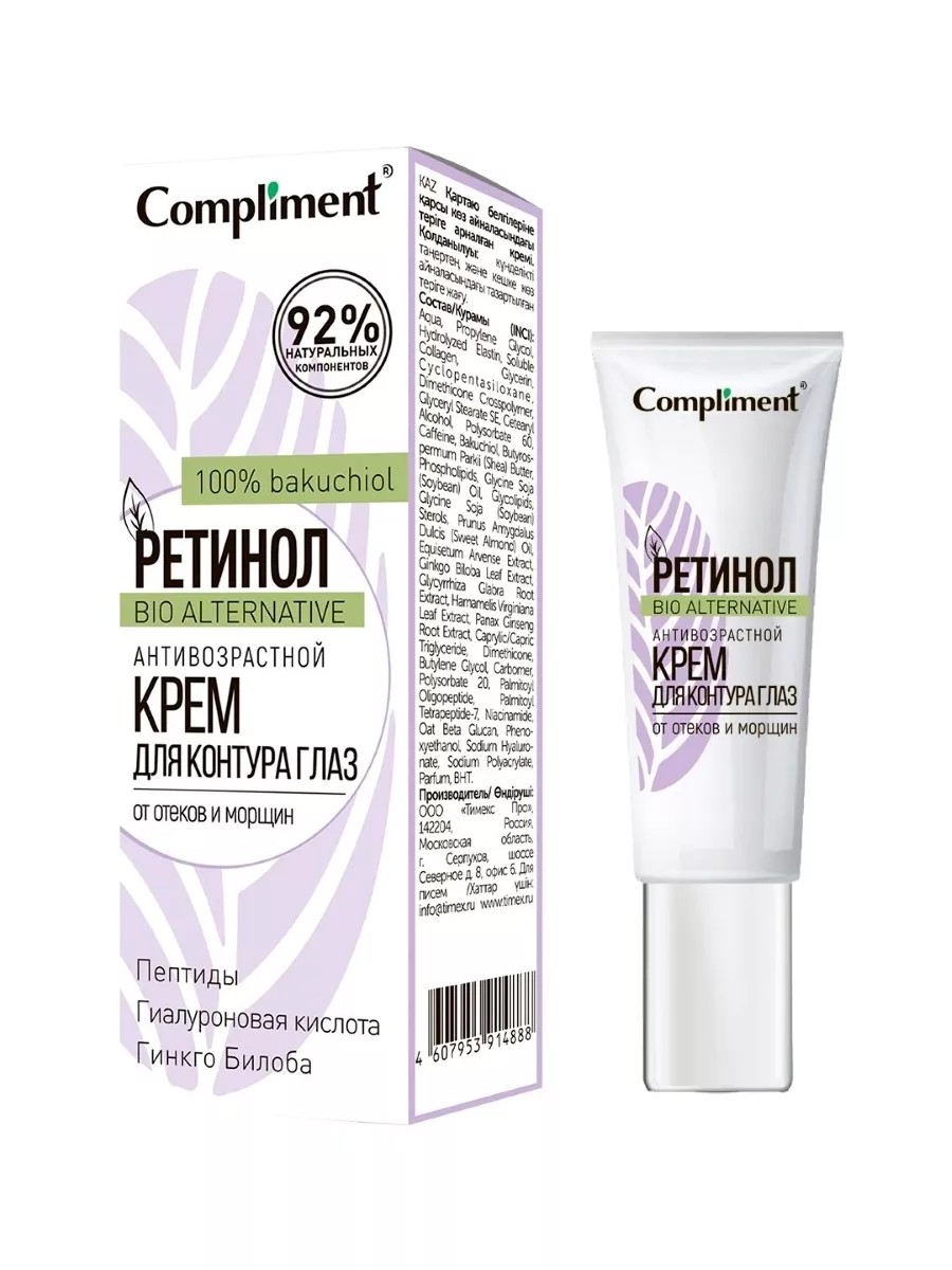 Compliment ретинол крем для контура глаз антивозрастной от отеков и морщин. Крем оказывает омолаживающее действие. Он содержит Bakuchiol, натуральный растительный ингредиент, называемый экспертами Bio Retinol, из-за его высокой эффективности в регенерации и восстановлении клеток кожи. Bakuchiol не проявляет нежелательных эффектов, характерных для ретинола, таких как раздражение и покраснение, поэтому он безопасен для чувствительной кожи и подходит для использования даже летом в течение дня. Формула, обогащенная пептидным комплексом, гиалуроновой кислотой и фосфолипидами, удерживает драгоценную влагу в коже и стимулирует регенерацию на клеточном уровне.