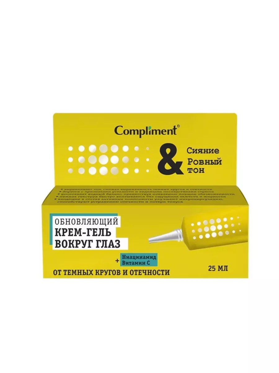 Compliment, Крем-гель вокруг глаз Сияние и ровный тон Обновляющий 25 мл. Выравнивает тон, снижая выраженность темных кругов и отечности. Борется с признаками усталости и видимыми последствиями стресса. Восполняет водный баланс, препятствуя появлению морщин обезвоженности. Нежная текстура быстро впитывается без ощущения тяжести и жирности. Входящие в состав активные компоненты улучшают микроциркуляцию, способствуют устранению отечности и потери тонуса. Витамин С- сильный антиоксидант с омолаживающим действием, придает коже заряд энергии для борьбы с оксидативным стрессом, замедляет механизмы фотостарения, предотвращая появление пигментных пятен и мелких морщинок. Ниацинамид усиливает антипигментационное действие и стимулирует синтез коллагена, улучшая состояние морщин и повышая эластичность кожи.