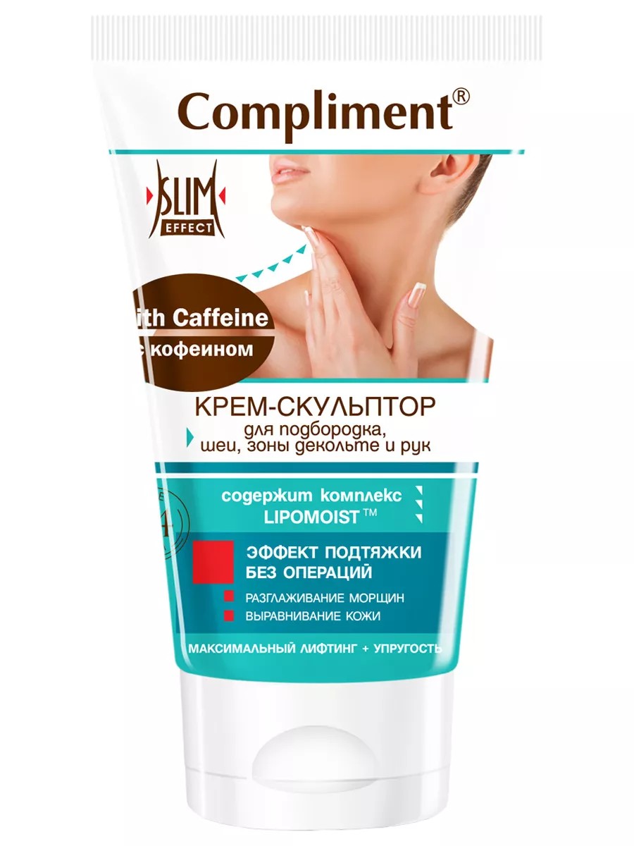 Compliment Крем-скульптор для подбородка, шеи, зоны декольте и рук с кофеином 150мл. Благодаря специальному комплексу «Lipomoist» уникальный подтягивающий крем борется с жировыми отложениями и восстанавливает упругость кожи подбородка, плеч и внутренней части предплечья. Кожа данных зон особенно подвержена провисанию, потере упругости, накоплению жира и воды, при минимальных возможностях коррекции. Благодаря комплексному воздействию комплекса «Lipomoist» и кофеина происходит расщепление и «сжигание» жира; выведение продуктов распада жировой ткани, улучшение лимфооттока, снятие отеков и одновременное укрепление кожи, восстановление ее упругости и гладкости. В результате контуры в зоне воздействия становятся более четкими, кожа подтягивается и выравнивается, происходит активная подтяжка и похудение.
