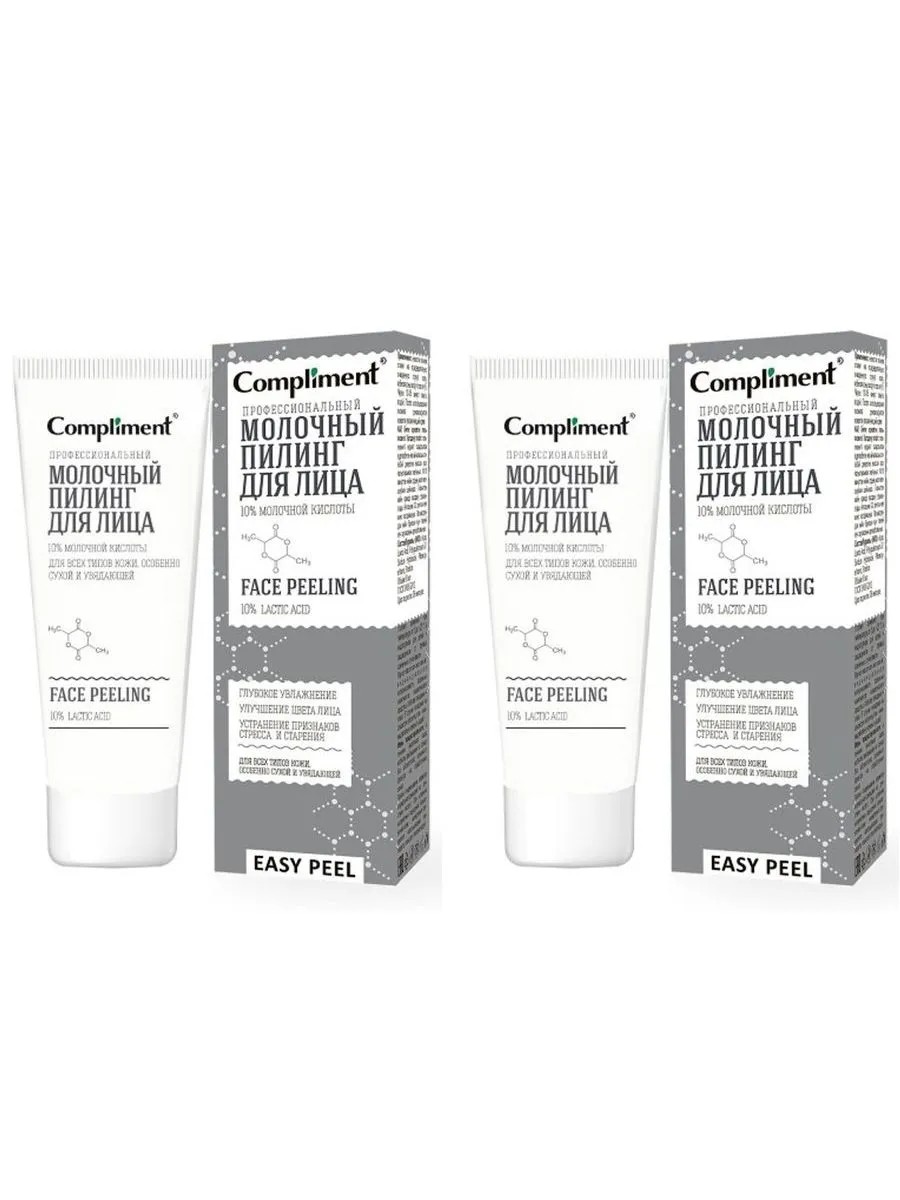 compliment пилинг для лица профессиональный молочный easy peel 80мл. увлажнение, улучшение цвета лица, устранение признаков стресса и старения для всех типов кожи, особенно сухой и увядающей с молочной кислотой бренд compliment.compliment easy peel профессиональный молочный пилинг для лица.профессиональный молочный пилинг для лица для всех типов кожи, особенно сухой и увядающей кожи с 10% молочной кислотой.благодаря тому, что молочная кислота является компонентом натурального увлажняющего фактора эпидермиса, молочный пилинг очень деликатно взаимодействует с кожным покровом, поддерживает высокий уровень его увлажненности.рекомендуется для коррекции косметических дефектов сухой и увядающей кожи. дает мощный омолаживающий и подтягивающий эффект. стимулирует обновление клеток, улучшая рельеф и структуру кожного покрова.молекулы молочной кислоты характеризуются высокой проникающей способностью, что позволяет стимулировать выработку коллагена, запуская и поддерживая процесс полного обновления и биоревитализации кожи.действует продолжительно, поднимая общий уровень упругости и плотности кожи. благодаря глубокому отшелушиванию, пилинг напрямую воздействует на локализацию и устранение последствий стресса кожи, таких как: сыпь, сухость, покраснения, неровности и очаги раздражений, морщины, желтоватый и серый цвет лица.обладает отбеливающим кожу действием, что особенно важно для кожи с признаками фотостарения и гиперпигментацией.результат:глубокое увлажнениеулучшение цвета лицаустранение признаков стресса и старениянанести тонким слоем на предварительно очищенную сухую кожу, избегая зоны вокруг глаз и губ.через 10- 15 минут смыть водой.после использования пилинга рекомендуется нанести увлажняющий крем с spf защитой.применять пилинг 2-3 раза в неделю.не рекомендуется держать препарат на коже дольше рекомендованного времени.меры предосторожности: в течение нескольких часов избегать пребывания на солнце без абсолютного солнечного фильтра на обработанных зонах. легкое пощипыва