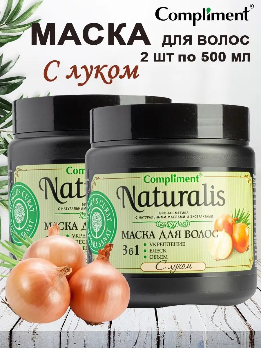 ONION HAIR MASK STRENGTHENING, SHINE, AND VOLUME NATURALIS COMPLIMENT 500 ML, 2 PCS. Onion mask is considered one of the most effective and efficient masks for strengthening hair. Frequent stress, poor nutrition, and other negative factors weaken hair follicles, preventing them from receiving the nutrients needed for active growth. Onion mask intensively nourishes hair roots, has an antibacterial effect, and has the ability to prevent excessive hair loss. This product not only strengthens the roots but also promotes their active saturation with oxygen by improving the blood supply to the scalp and providing nutrients. Hair becomes smoother, more voluminous, and shinier. APPLICATION OF THE MASK: Apply to damp hair and scalp and leave on for 10-15 minutes. Rinse with warm water. Use 2-3 times a week for 1-2 months. ATTENTION! Do not use the mask on broken skin, avoid contact with eyes or mucous membranes. If contact occurs, rinse with plenty of cold water. It is recommended to test the mask on the skin behind the ear or on the elbow before use.