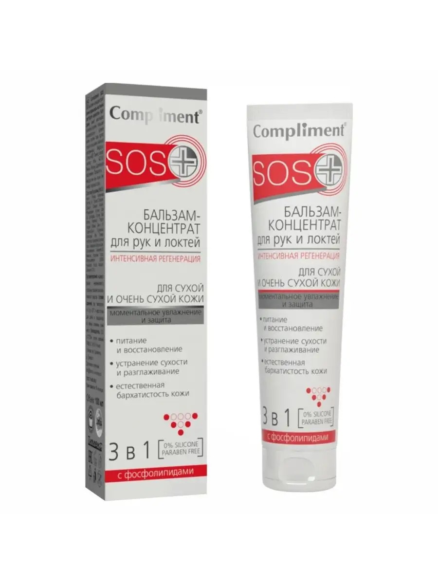 Compliment SOS+ Бальзам-концентрат Интенсивная регенерация 100мл. Если кожа на руках стала сухой и шелушится, остро реагирует на жесткую водопроводную воду и холодную погоду, легко раздражается и потеряла естественную красоту. Доверьте спасение Вашей кожи регенерирующей рецептуре бальзам-концентрата для рук и локтей SOS+ ИНТЕНСИВНАЯ РЕГЕНЕРАЦИЯ. Результат: Мгновенное питание*: Интенсивное восстановление*:*по результатам теста отдельной группы женщин. Насыщенный бальзам-концентрат создан для немедленной регенерации поврежденной и сухой кожи рук и локтей. Мгновенно увлажняет и защищает поверхность эпидермиса от неблагоприятных факторов внешней среды. Усиленная формула из натуральных компонентов быстро и интенсивно спасает от сухости, шелушения и огрубения кожи. Предупреждает потерю влаги, восстанавливает и успокаивает раздраженную кожу. Нежная текстура быстро впитывается, смягчая кожу и делая ее упругой и эластичной. Применение: наносите легкими массирующими движениями на чистую сухую кожу рук и локтей до полного впитывания. Активные ингредиенты: Фосфолипиды укрепляют эпидермальный барьер кожи, нормализуя функционирование липидного слоя кожи. Кожа восстанавливается и активно противостоит внешним неблагоприятным воздействиям. Протеины молока помогают удерживать влагу в коже и способствуют восстановлению ее тургора. Обладают легким отбеливающим эффектом и помогают справиться с пигментацией. Масло абрикосовых косточек — источник полиненасыщенных жирных кислот. Оно великолепно питает и оказывает омолаживающее действие. Проникая в глубокие слои, масло подтягивает и разглаживает кожу. Масло зародышей пшеницы выравнивает цвет и улучшает состояние кожи, стимулирует систему обновления клеток и замедляет процессы старения. Натуральный пчелиный воск смягчает и успокаивает кожу, а также стимулирует регенерацию тканей. Придает коже свежесть и гладкость, повышает ее эластичность и упругость.