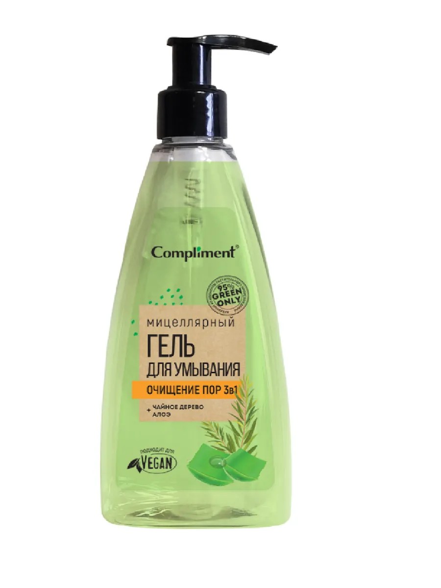 Compliment, Мицеллярный гель для умывания очищение пор Green only 3в1, 250 мл. На 95% натуральная формула очищает поры, не разрушая липидного барьера кожи, не вызывает чувства сухости и стянутости после применения. Салициловая кислота оказывает поросуживающее действие, подсушивает раздражения, регулирует активность сальных желез, предотвращая появление жирного блеска. Известно антибактериальными и успокаивающими свойствами, нормализующими состояние кожи. Алоэ способствует ускорению заживления очагов раздражения, последствий воспалений и акне. Успокаивает и увлажняет чувствительную и сухую кожу. Масло чайного дерева - природный матирующий компонент, контролирует появление жирности и блеска после умывания, придает коже ощутимую бархатистость.