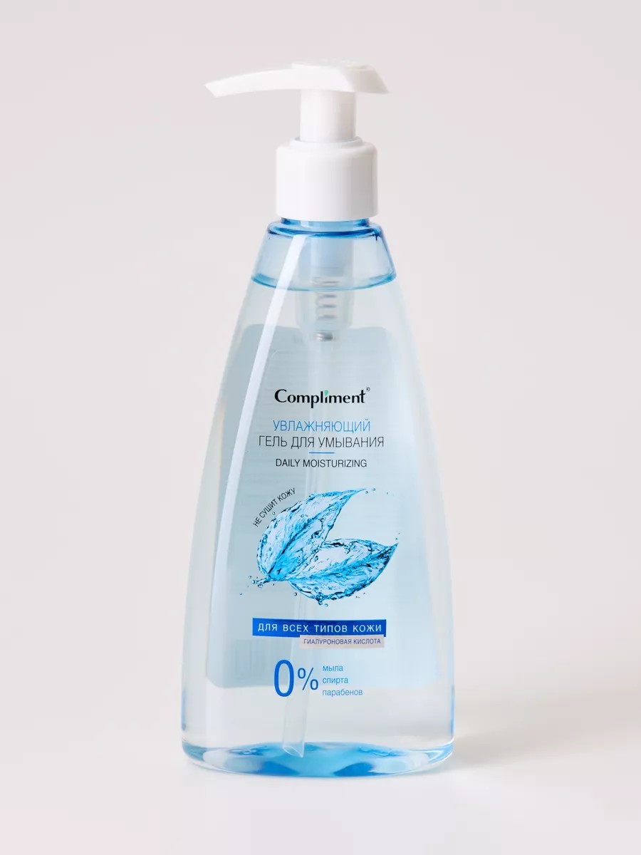 Compliment Увлажняющий Гель для умывания для всех типов кожи 250мл. Гель для умывания применяется для глубокой очистки кожи, защищает липидный слой, предотвращает и снижает воспаления, заживляет мелкие повреждения, имеет выраженное антибактериальное действие, увлажняет и возвращает коже естественный уровень рН. Он очищает кожу от загрязнений и избытков кожного сала, оставляя ее чистой и свежей. Гиалуроновая кислота регулирует водный баланс кожи, повышает тонус и эластичность, образует эластичную пленку, которая ограничивает испарение и таким образом связывает воду. Все это создает эффект гладкости и увлажненности кожи. Мягкая моющая основа без содержания мыла нейтрализует действие известковой воды, вызывающей сухость кожи. Гель для умывания - это универсальный средство для очищения кожи лица. Он эффективно удаляет загрязнения, излишки кожного сала и макияж, не пересушивая кожу. Гель для умывания подходит для всех типов кожи, в том числе и для чувствительной.