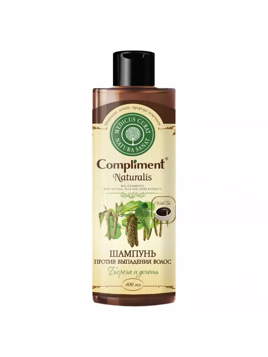 Compliment, Naturalis Shampoo, Birch and Tar, 400 ml. Birch is a rich source of vitamins and nutrients that give hair elasticity, a healthy appearance, and shine, stimulating growth and preventing hair loss. Hair is easy to comb, and hair becomes more voluminous and full. Tar contains biologically active substances that heal the scalp, enhance nutrition of the hair roots, and provide them with the vitamins necessary for active growth. Thanks to it, hair regains vitality, reducing breakage and hair loss.