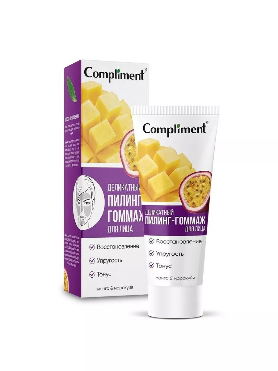 Compliment Пилинг-гоммаж для лица деликатный Манго и Маракуя 80 мл, 1 шт. Деликатный пилинг-гоммаж подарит вашей коже отпуск на тропическом острове, зарядит ее сочной энергией ароматной мякоти экзотических фруктов, восстановит, вернет тонус, упругость и здоровый сияющий вид. Средство действует сразу в нескольких направлениях: легкое скрабирование, мягкая эксфолиация, обновляющая маска. Благодаря сбалансированному комплексу из АНА-кислот пилинг-гоммаж улучшает микрорельеф кожи, обладает антиоксидантным действием, стимулирует синтез коллагена. Фитоэнзимы способствуют детоксикации кожи, выравниванию тона и микрорельефа, нормализуют жирность, уменьшают последствия угревой сыпи. Белая глина очищает, сужает поры и выравнивает рельеф, придает ровный матовый тон. Бережная формула пилинг-гоммажа подарит вашей коже здоровый и сияющий вид.