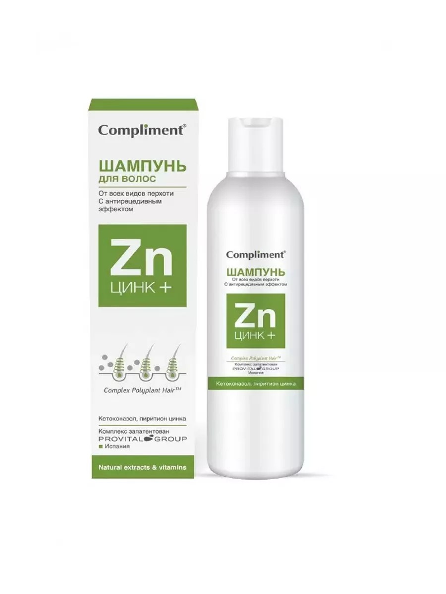 Compliment, Zinc+ Shampoo for Hair against All Types of Dandruff, 200 ml, 1 pc. This moisturizing dermatological shampoo is designed for all hair types and dandruff of various origins. Ketoconazole and zinc pyrithione help reduce dandruff formation and combat its causes, effectively eliminating pathogenic fungi. Salicylic acid soothes irritated scalp, preventing itching and providing an antiseptic effect. The gentle, cleansing formula does not irritate the skin and gently cleanses hair without damaging its protective layer. The visible effect of this shampoo is noticeable after the first use. With regular use, it prevents the recurrence of dandruff and improves the condition of sensitive skin.