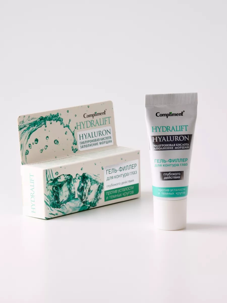 Compliment Hydralift Hyaluron Eye Contour Gel Filler 25ml. This highly effective gel filler, based on stabilized hyaluronic acid, is specially formulated to fill wrinkles in the sensitive and delicate eye contour area. This product perfectly hydrates the skin around the eyes, both from the inside and outside, making it more elastic and firm, improving microrelief, and preventing the appearance of wrinkles. Hyaluronic acid microparticles are evenly distributed under the skin and in folds, preventing dehydration and preventing the loss of vital moisture, creating a natural, intensely hydrating effect. The gel prevents premature aging and helps protect collagen fibers from deterioration. This instant-action product will restore skin in just one application. The light, gel-like texture is quickly absorbed, dries instantly, helps eliminate dark circles under the eyes, relieves discomfort, and relaxes and soothes the skin around the eyes. Ingredients: Aqua, Glycerin, PEG-40 Hydrogenated Castor Oil, Propylene Glycol, Equisetum Arvense Extract, Ginkgo Biloba Leaf Extract, Glycyrrhiza Glabra Root Extract, Hamamelis Virginiana Leaf Extract, Panax Ginseng Root Extract, Sodium Hyaluronate, Carbomer, Triethanolamine, Caffeine, Panthenol, Allantoin, Disodium EDTA, Phenoxyethanol, Parfum.