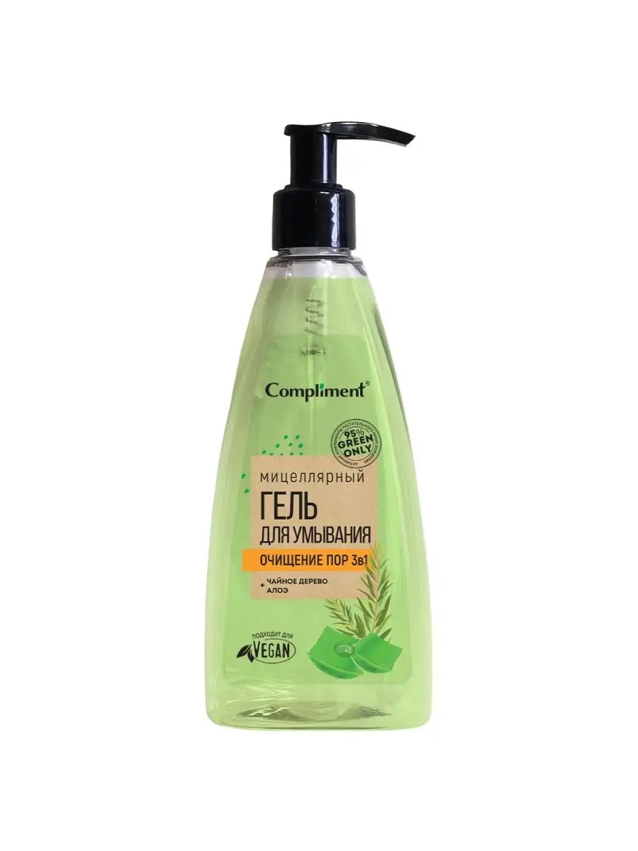 Compliment Green Only Мицеллярный гель для умывания Очищение пор 3в1 250мл. Три простых шага к чистой матовой коже: 1. Глубокое очищение пор и кожи лица. На 95% натуральная формула очищает поры, не разрушая липидного барьера кожи, не вызывает чувства сухости и стянутости после применения.2. Сужение пор и тонизирование. Салициловая кислота оказывает поросуживающее действие, подсушивает раздражения, регулирует активность сальных желез, предотвращая появление жирного блеска. Известно антибактериальными и успокаивающими свойствами, нормализующими состояние кожи. 3. Матирование и регенерация. Алоэ способствует ускорению заживления очагов раздражения, последствий воспалений и акне. Успокаивает и увлажняет чувствительную и сухую кожу. Масло чайного дерева - природный матирующий компонент, контролирует появление жирности и блеска после умывания, придает коже ощутимую бархатистость. Гель для умывания - это универсальный средство для очищения кожи лица. Он эффективно удаляет загрязнения, излишки кожного сала и макияж, не пересушивая кожу. Гель для умывания подходит для всех типов кожи, в том числе и для чувствительной.