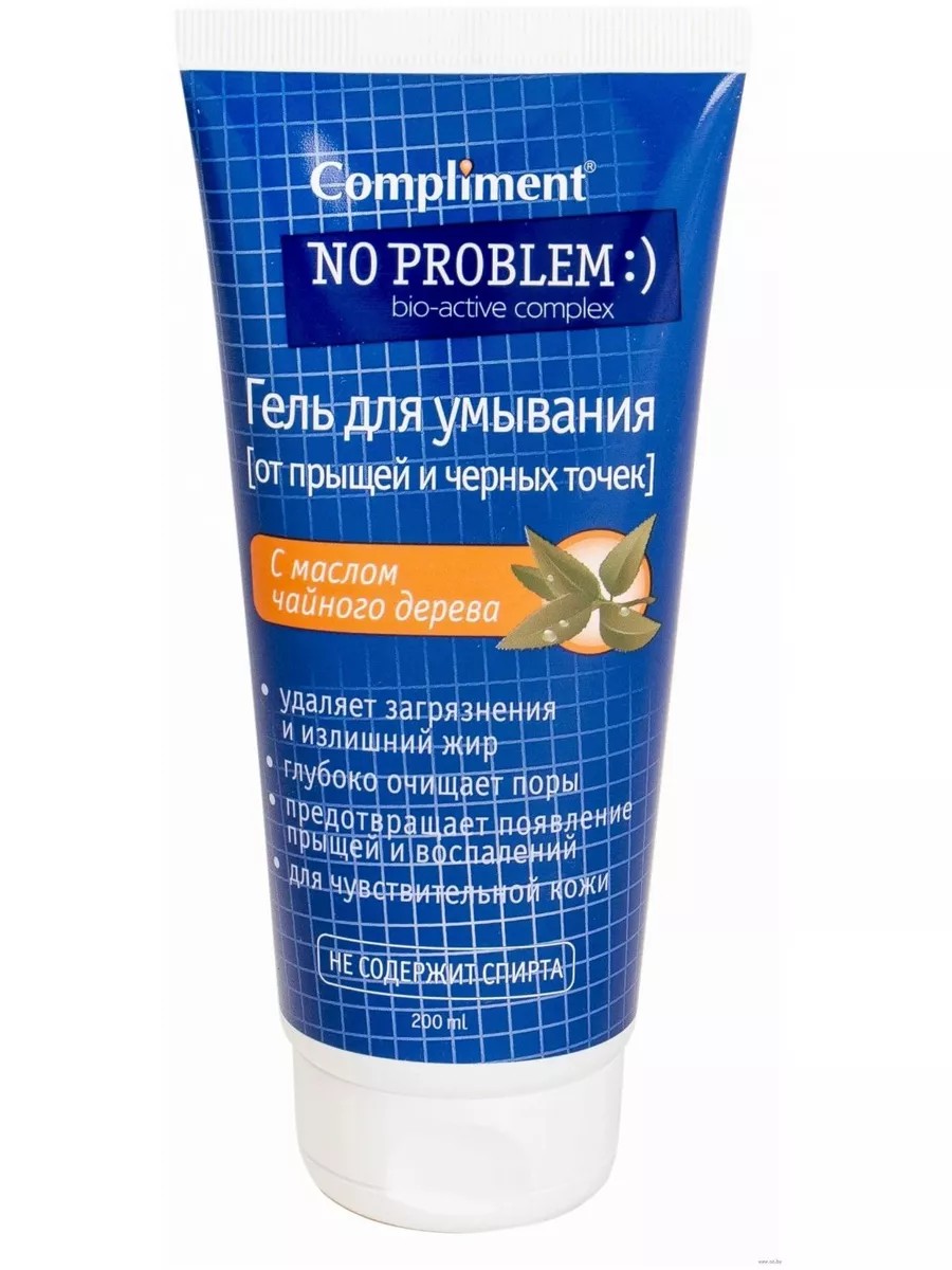COMPLIMENT No Problem Cleansing Gel with Tea Tree Oil, 200 ml. Use Compliment No Problem gel with tea tree oil against acne and blackheads. It gently cleanses your face, kills bacteria and tightens pores. The product prevents the occurrence of subsequent imperfections, provides a prolonged effect, does not leave a greasy shine and does not cause dryness. Suitable for problematic, sensitive and irritated skin. Ingredients: Aqua, Sodium Lauroyl Sarcosinate, Cocamidopropyl Betaine, Glycerin, PEG - 40 Hydrogenated Castor Oil, Hydroxyethylcellulose, Phenoxyethanol, Chamomilla Recutita Extract, Salicylic acid, Malaleuca Alternifolia Oil, Perfume, Disodium EDTA; Area of use: Face; Volume: 200; Expiration date: 730; Target audience: Adult; Skin type: For all skin types; Skin care product type: gel;