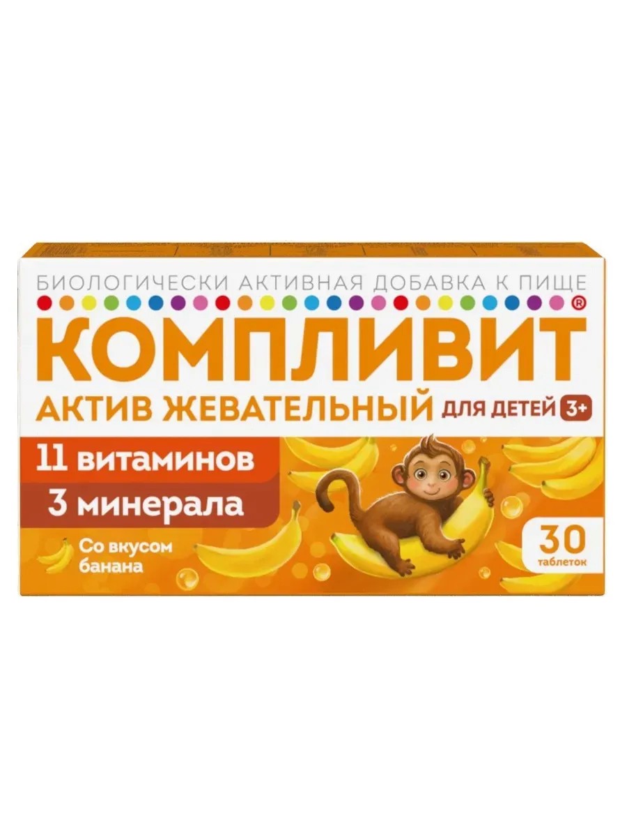 кальция гидрофосфата дигидрат, сахар, декстроза, магния оксид, аскорбиновая кислота (витамин С), носитель поливинилполипирролидон (кросповидон), агент антислеживающий тальк, агент антислеживающий магниевая соль стеариновой кислоты, никотинамид, d,l-?-токоферола ацетат (витамин Е), крахмал картофельный, наполнитель крахмал модифицированный, ароматизатор натуральный "банан" (мальтодекстрин, банановое пюре), ретинола ацетат (витамин А), кальция пантотенат, пиридоксина гидрохлорид (витамин В6), рибофлавин (витамин В2), тиамина гидрохлорид (витамин В1), холекальциферол (витамин Д3), комплексная пищевая добавка Коликоат Протект (полиэтиленгликоль и поливинилового спирта сополимер, поливиниловый спирт Е1203, диоксид кремния Е551), фолиевая кислота, натрия йодид, цианокобаламин (витамин В12)