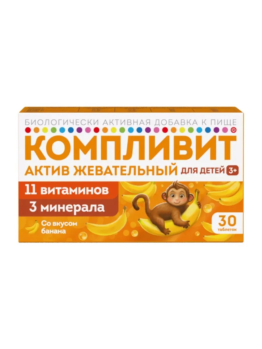Компливит Актив жевательный — сбалансированный комплекс важнейших витаминов и минералов со вкусом банана для здорового роста и крепкого иммунитета ребенка.