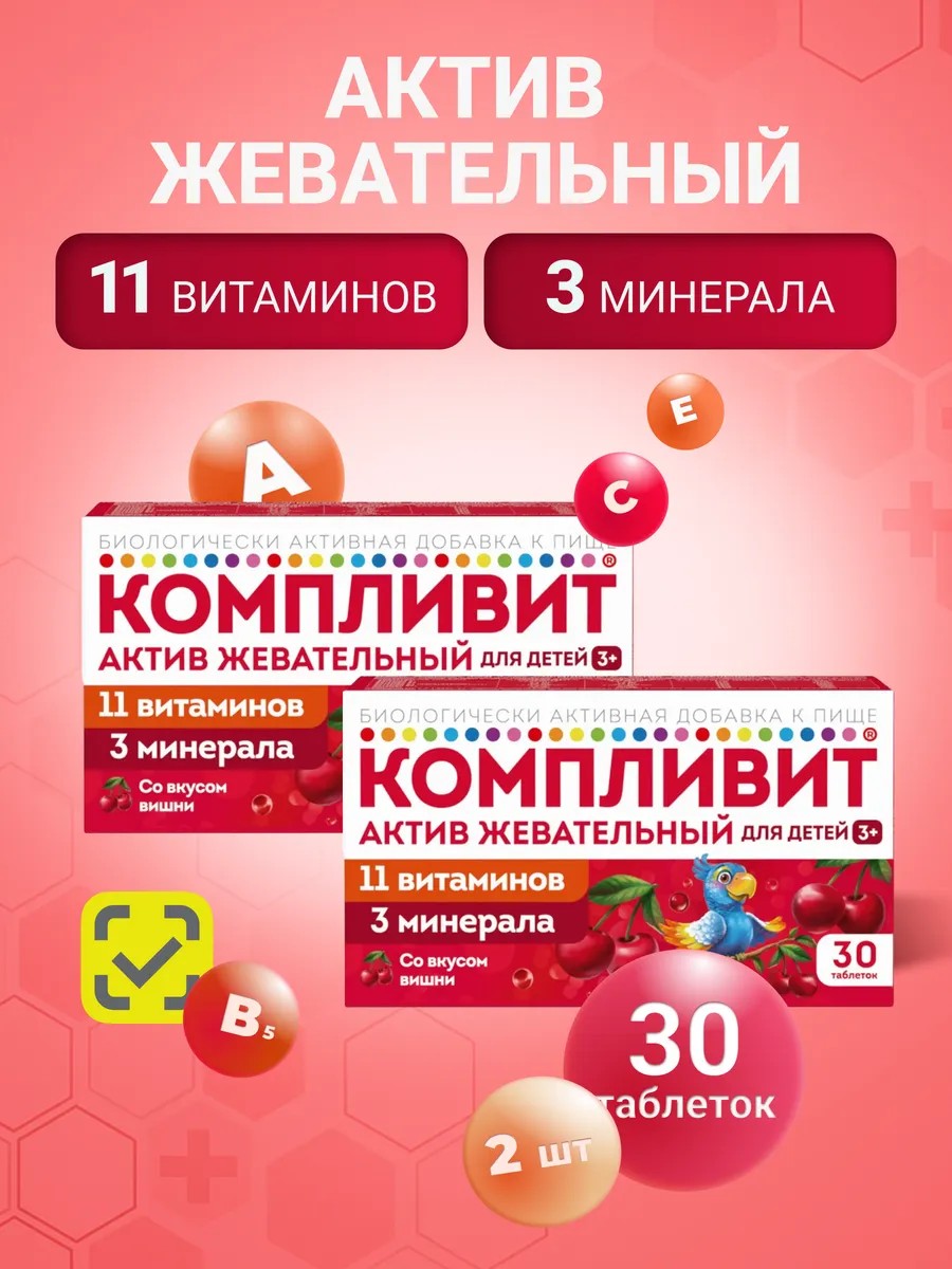 Если вы хотите поддержать здоровье своего ребенка, обратите внимание на Компливит Актив Вишня — это витаминно-минеральный комплекс в жевательных таблетках со вкусом вишни, который дети принимают с удовольствием. В составе — 12 витаминов и 3 минерала, включая кальций, магний, йод, а также витамины группы B, C, D3 и E. Такой комплекс помогает укрепить иммунитет, поддерживает рост и развитие, способствует формированию крепких костей и зубов, улучшает память и концентрацию внимания.