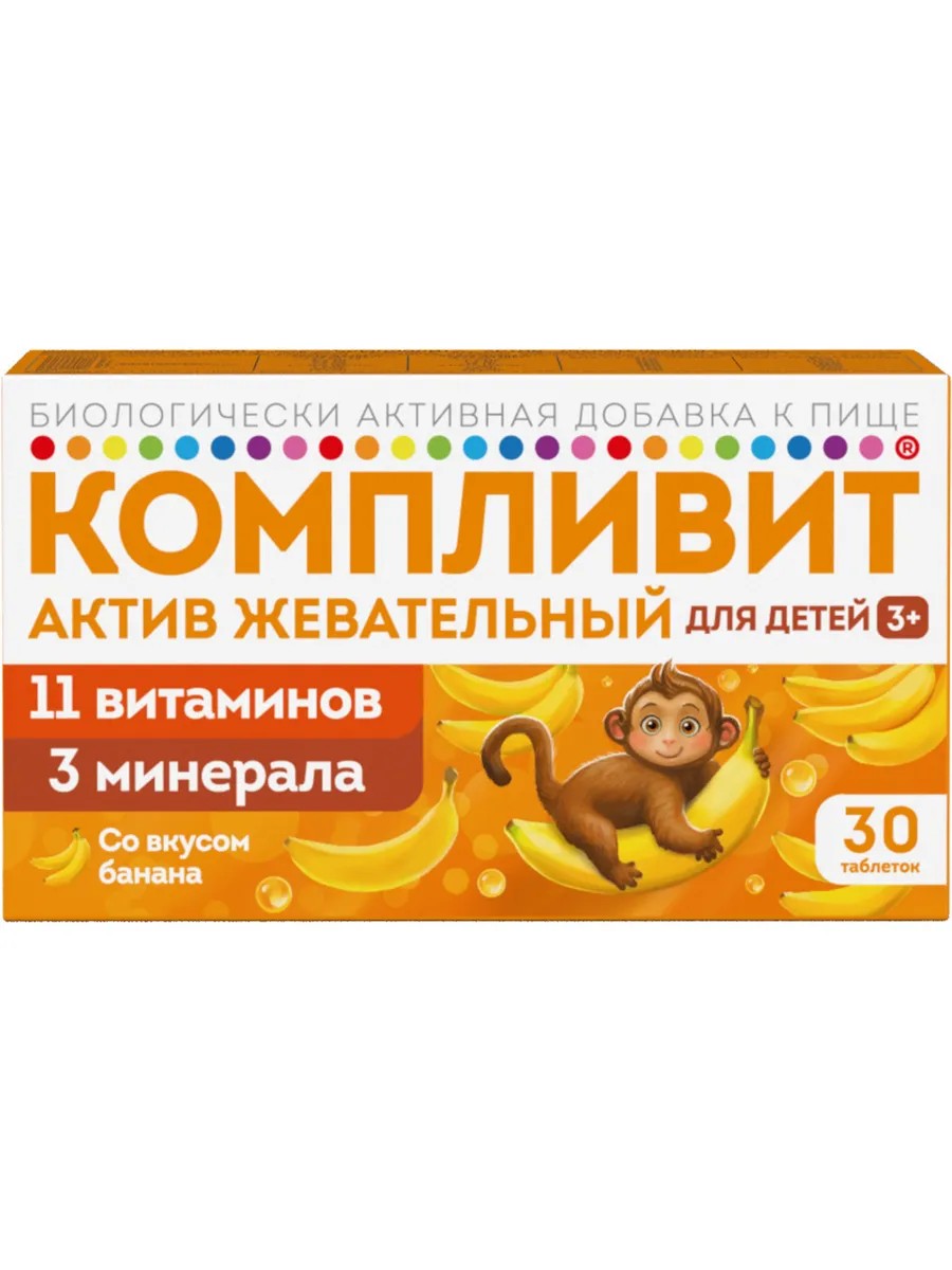 Компливит Актив жевательные витамины для детей с 3-х лет — это комплекс, который помогает родителям заботиться о здоровье своих детей. Важно, чтобы дети получали все необходимые витамины и минералы для полноценного роста и развития. БАД сочетает в себе приятный вкус и комплексную витаминную поддержку, делая ежедневный прием витаминов не только полезным, но и радостным для ребенка.
