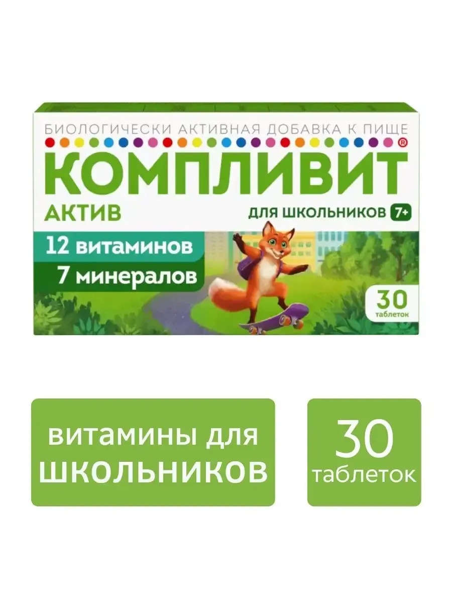 Витаминно-минеральный комплекс для школьников помогает справляться с нагрузками в школе и укреплять иммунитет ребенка. Компливит Актив восполняет недостаток витаминов и минералов. Компоненты комплекса необходимы для поддержки организма ребенка в период интенсивного роста и развития, при физических и умственных нагрузках, для повышения устойчивости организма к инфекциям, для поддержки нервной системы в период адаптации к школе, поддержки памяти и интеллекта ребенка. БАД к пище Компливит Актив является дополнительным источником витаминов А, С, Е, D (в 1 таблетке 200 МЕ), витаминов группы В (В1, В2, В3, В5, В6, В12) , фолиевой кислоты, минеральных элементов (железа, меди, цинка, селена, йода, марганца, магния). Витамин А необходим для иммунной защиты организма ребенка. Он повышает барьерную функцию слизистых оболочек, повышает сопротивляемость организма к вирусным и бактериальным инфекциям , участвует в синтезе зрительных пигментов, необходим для сумеречного и цветового зрения. Витамин Д необходим для формирования и роста костей, для здорового состояния кожи, зубов, волос. Витамин Е обладает выраженными антиоксидантными свойствами, способствует укреплению иммунитета и повышению защитных сил организма. При недостатке в организме витамина Е организм подвергается инфекционным заболеваниям, возникает риск воспалительных процессов, появляется мышечная слабость. Витамин С играет важную роль в работе иммунной системы, способствуя повышению устойчивости организма к инфекциям; обеспечивает синтез коллагена, участвует в формировании и поддержании структуры и функции хрящей, костей, зубов. Витамин С способствует поддержанию в здоровом состоянии кожи, снижает воспалительные реакции. Витамин D регулирует обмен кальция и фосфора в организме, обеспечивает их лучшее усвоение, необходим для формирования опорно-двигательного аппарата ребенка. Железо поддерживает функционирование иммунной системы, необходимо для процессов кроветворения, умственного развития, работы желудочно-кишечного тракта. Дефицит железа может приводить к анемии, повышенной утомляемости, снижению работоспособности. Медь способствует антиоксидантной защите клеток, участвует в синтезе коллагена, предупреждает анемию и кислородное голодание органов и тканей, способствует укреплению костей. Укрепляет стенки сосудов. Цинк укрепляет иммунитет, повышает сопротивляемость организма к инфекциям. Магний уменьшает возбудимость нервных клеток, оказывает успокаивающее действие. Рекомендации по применению: детям в возрасте с 7 до 14 лет по 1 таблетке 1 раз в день во время еды. Продолжительность приема – 1 месяц. Перед применением БАД детьми необходимо проконсультироваться с врачом-педиатром. БАД НЕ ЯВЛЯЕТСЯ ЛЕКАРСТВЕННЫМ СРЕДСТВОМ.