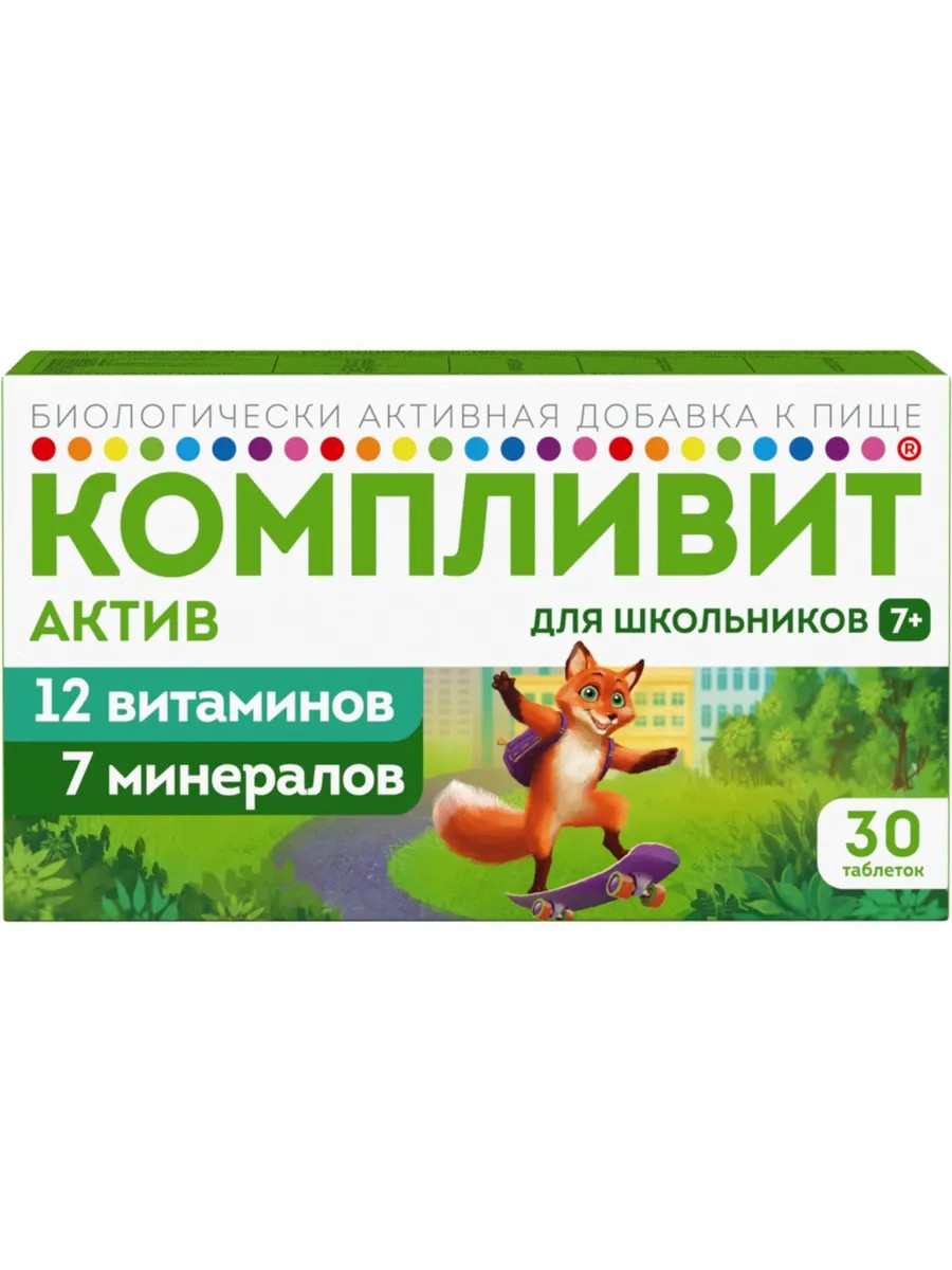 Витаминно-минеральный комплекс для школьников помогает справляться с нагрузками в школе и укреплять иммунитет ребенка. Компливит Актив восполняет недостаток витаминов и минералов. Компоненты комплекса необходимы для поддержки организма ребенка в период интенсивного роста и развития, при физических и умственных нагрузках, для повышения устойчивости организма к инфекциям, для поддержки нервной системы в период адаптации к школе, поддержки памяти и интеллекта ребенка. БАД к пище Компливит Актив является дополнительным источником витаминов А, С, Е, D (в 1 таблетке 200 МЕ), витаминов группы В (В1, В2, В3, В5, В6, В12) , фолиевой кислоты, минеральных элементов (железа, меди, цинка, селена, йода, марганца, магния). Витамин А необходим для иммунной защиты организма ребенка. Он повышает барьерную функцию слизистых оболочек, повышает сопротивляемость организма к вирусным и бактериальным инфекциям , участвует в синтезе зрительных пигментов, необходим для сумеречного и цветового зрения. Витамин Д необходим для формирования и роста костей, для здорового состояния кожи, зубов, волос. Витамин Е обладает выраженными антиоксидантными свойствами, способствует укреплению иммунитета и повышению защитных сил организма. При недостатке в организме витамина Е организм подвергается инфекционным заболеваниям, возникает риск воспалительных процессов, появляется мышечная слабость. Витамин С играет важную роль в работе иммунной системы, способствуя повышению устойчивости организма к инфекциям; обеспечивает синтез коллагена, участвует в формировании и поддержании структуры и функции хрящей, костей, зубов. Витамин С способствует поддержанию в здоровом состоянии кожи, снижает воспалительные реакции. Витамин D регулирует обмен кальция и фосфора в организме, обеспечивает их лучшее усвоение, необходим для формирования опорно-двигательного аппарата ребенка. Железо поддерживает функционирование иммунной системы, необходимо для процессов кроветворения, умственного развития, работы желудочно-кишечного тракта. Дефицит железа может приводить к анемии, повышенной утомляемости, снижению работоспособности. Медь способствует антиоксидантной защите клеток, участвует в синтезе коллагена, предупреждает анемию и кислородное голодание органов и тканей, способствует укреплению костей. Укрепляет стенки сосудов. Цинк укрепляет иммунитет, повышает сопротивляемость организма к инфекциям. Магний уменьшает возбудимость нервных клеток, оказывает успокаивающее действие. Рекомендации по применению: детям в возрасте с 7 до 14 лет по 1 таблетке 1 раз в день во время еды. Продолжительность приема – 1 месяц. Перед применением БАД детьми необходимо проконсультироваться с врачом-педиатром. БАД НЕ ЯВЛЯЕТСЯ ЛЕКАРСТВЕННЫМ СРЕДСТВОМ.