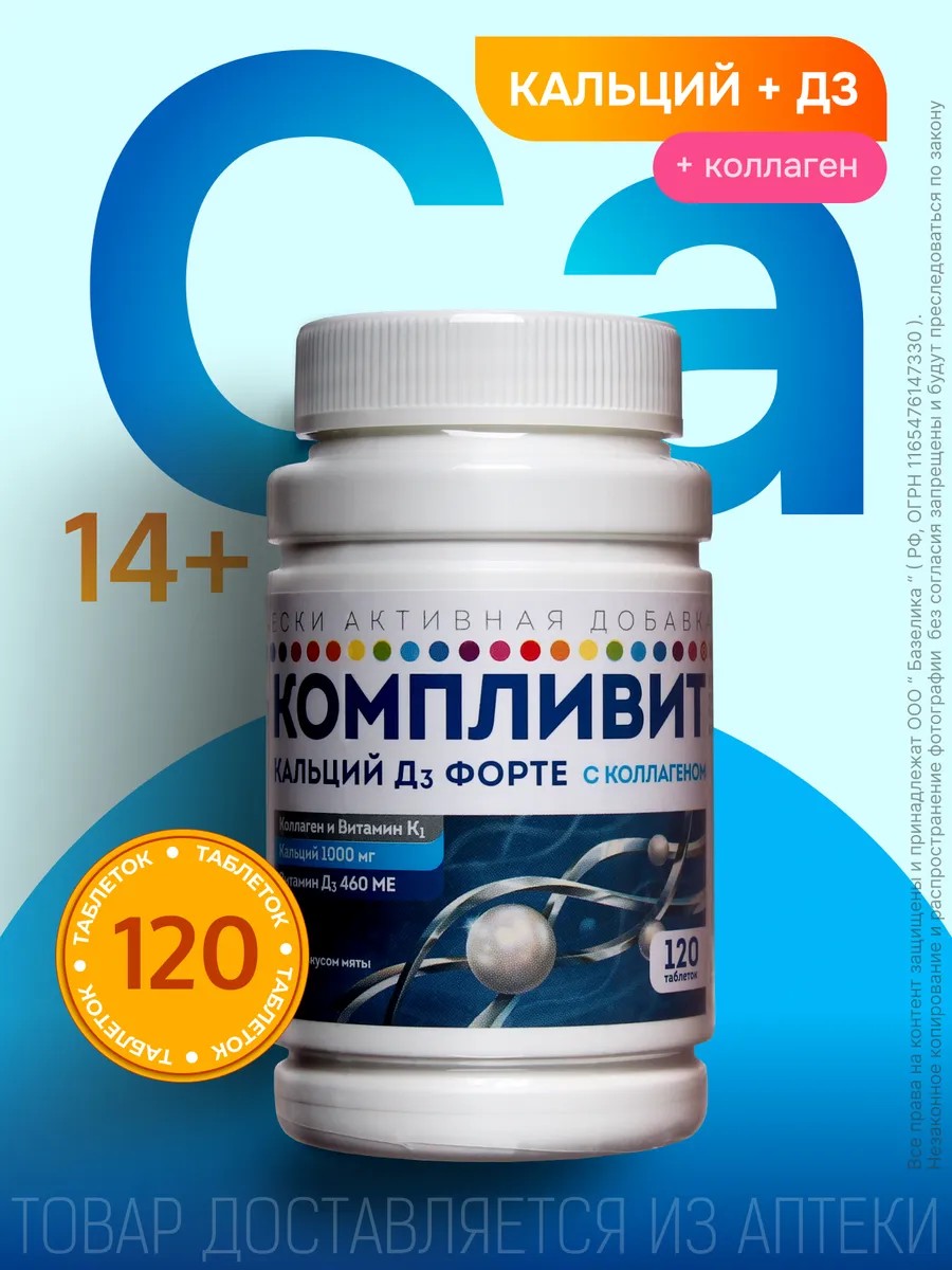 | Комплектация | Компливит Кальций Д3 Форте с коллагеном таблетки жевательные массой 1800 мг мята БАД 120 шт |
