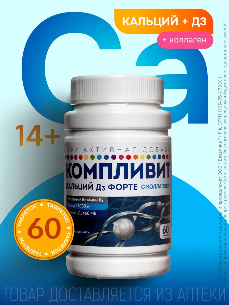 | Комплектация | Компливит Кальций Д3 Форте с коллагеном таблетки жевательные массой 1800 мг мята БАД 60 шт |