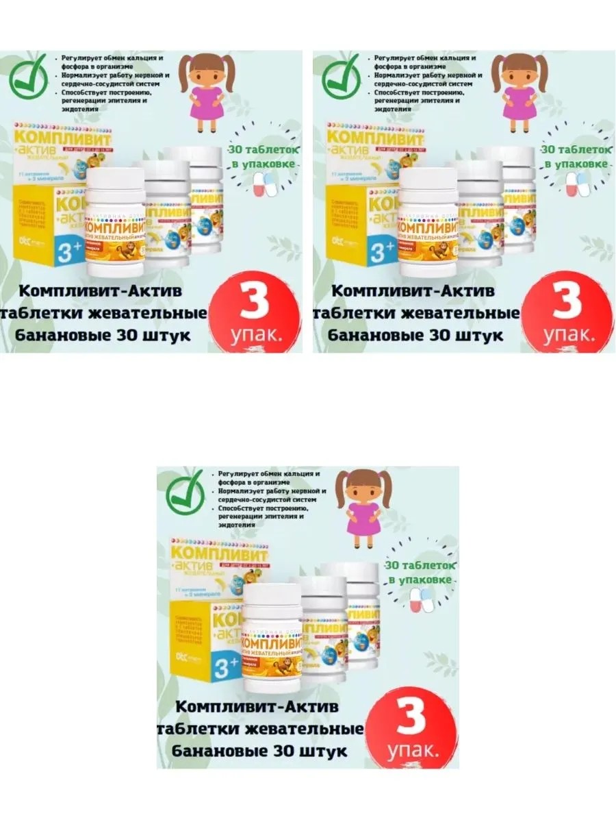 Компливит Актив жевательный — сбалансированный витаминно-минеральный комплекс для детей с 3 лет со вкусом банана. Действие Компливит Актив жевательный обусловлено свойствами входящих в состав компонентов. Комплекс витаминов и минералов, являющихся важными факторами полноценного физического и интеллектуального развития ребенка, укрепления иммунитета, усиления адаптационных возможностей организма. Сбалансирован с учетом рекомендуемых уровней потребления микронутриентов. Восполняет недостаток витаминов и минералов. Компоненты комплекса необходимы для поддержки организма ребенка в период интенсивного роста и развития, при физических и умственных нагрузках, для повышения устойчивости организма к инфекциям, для поддержки нервной системы и облегчения адаптации к детскому саду и школе, поддержки памяти и интеллекта ребенка. РЕКОМЕНДАЦИИ ПО ПРИМЕНЕНИЮ: Детям от 3 до 6 лет по 1 таблетке 1 раз в день во время еды, детям от 7 до 10 лет – по 1 таблетке 2 раза в день во время еды. Продолжительность приема – 1 месяц. Перед применением БАД детьми необходимо проконсультироваться с врачом-педиатром, лицам с заболеваниями щитовидной железы перед применением необходимопроконсультироваться с врачом-эндокринологом. Детям принимать БАД по согласованиюи под наблюдением врача-педиатра.