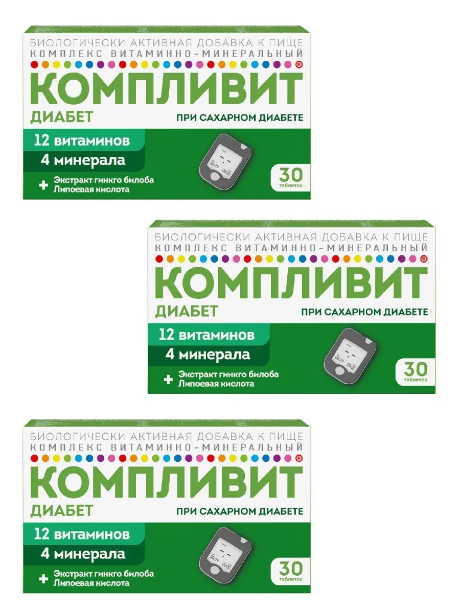 это биологически активная добавка (БАД) к пище - комплексный препарат, разработанный специально для людей, страдающих сахарным диабетом. Его состав включает в себя все необходимые витамины, минералы и другие полезные вещества, которые помогают регулировать уровень сахара в крови и улучшают общее состояние здоровья. Кроме того, Компливит диабет способствует укреплению иммунитета и улучшению работы сердечно-сосудистой системы. Препарат выпускается в виде покрытых оболочкой таблеток, упаковка содержит 30 штук. Рекомендуется принимать по 1 таблетке в день во время еды. Перед использованием рекомендуется проконсультироваться с врачом.