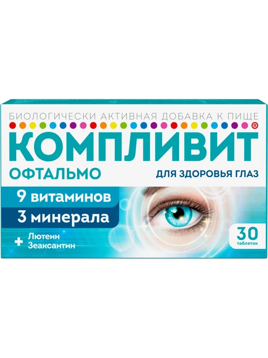 Компливит Офтальмо - это биологически активная добавка к пище, разработанная российской фармацевтической компанией. При производстве используется специальная технология, которая обеспечивает совместимость всех компонентов в 1 таблетке. По данным научных исследований: Витамины, минералы и растительные каротиноиды (лютеин и зеаксантин) играют важную роль в регуляции работы органов зрения, улучшают функциональное состояние. Дефицит их потребления в ряде случаев может приводить к различным нарушениям зрения и заболеваниям зрительного аппарата. Лютеин и зеаксантин не синтезируются в организме и поступают только извне. Именно от содержания данных каротиноидов зависит плотность макулярного пигмента. Помимо каротиноидов, рядом исследований подтверждалась роль других витаминов и микроэлементов с антиоксидантным действием (селен, витамины С, Е, цинк, медь) в поддержании функций сетчатки и органа зрения в целом. В 2017 году был опубликован обзор, включавший 19 клинических исследований (10 исследований были из Европы, 6 из США, 2 из Китая и 1 из Австралии). В этих исследованиях сравнивали поливитаминные добавки, цинк, витамин Е, лютеин и зеаксантин с плацебо, в которых анализировалось влияние витаминных добавок. В результате было показано, что прием витаминно-минеральных комплексов может способствовать снижению риска развития возрастных заболеваний глаз и сохранению зрения. Таким образом, результаты мультицентровых масштабных клинических исследований подтвердили потенциальную эффективность антиоксидантных витаминно-минеральных комплексов с растительными каротиноидами, которые могут применяться при несбалансированном питании, нарушениях функционирования желудочно-кишечного тракта, повышенных зрительных и психоэмоциональных нагрузках, интенсивном воздействии ультрафиолетового света.