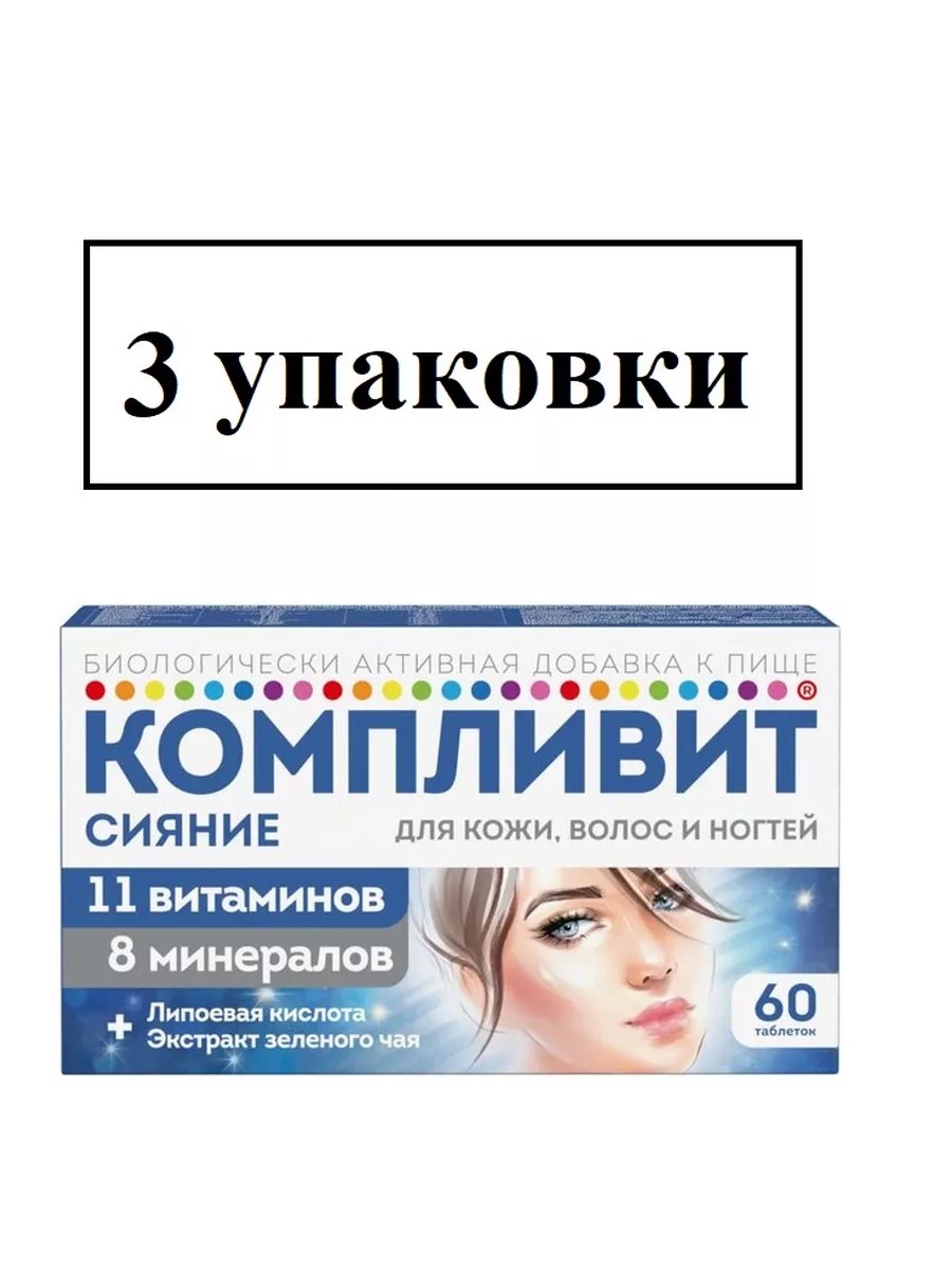 КОМПЛИВИТ СИЯНИЕ представляет собой комплекс витаминов, минералов, витаминоподобных веществ и экстракта зеленого чая. Использование комплекса помогает улучшить состояние кожи, ногтей и волос, особенно в условиях неблагоприятной городской экологии. Действие комплекса обусловлено свойствами входящих в его состав компонентов. Комплекс содержит 11 витаминов, 8 минералов, экстракт зеленого чая, липоевую кислоту. Комбинация витаминов, минералов и витаминоподобных веществ, входящих в состав КОМПЛИВИТа СИЯНИЕ, обеспечивает следующие эффекты (по литературным данным): антиоксидантный (защита клеток от разрушительного действия свободных радикалов); поддерживает синтез коллагена, обеспечивающего тонус кожи; способствует защите кожи от УФ-излучения; способствует регенерации тканей (в том числе эпителиальных); оказывает дезинтоксикационное действие (способствует выведению из организма токсинов, тяжелых металлов); стимулирует защитные силы организма.