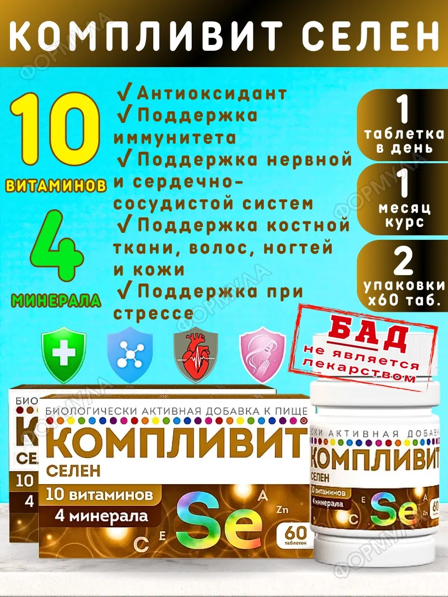 Компливит Селен витаминный комплекс для поддержки иммунитета и энергии - сбалансированное сочетание витаминов A, B1, B2, B3, B5, B6, B9, B12, C, E и минеров: меди, цинка, марганца, селена.