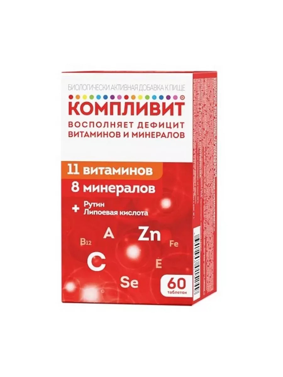 Витаминно-минеральный комплекс Компливит содержит 21 компонент для поддержания здоровья и укрепления всего организма. Используется в качестве профилактического средства при состояниях, сопровождающихся нехваткой в витаминах и минералах. Такое состояние может быть в период роста и развития, повышенной физической и нервно-физической нагрузки, в период выздоровления после перенесенных заболеваний, при несбалансированном и неполноценном питании, для повышения сопротивляемости организма к инфекционным и простудным заболеваниям. В состав комплекса Компливит входит ретинола ацетат, который обеспечивает нормальную функцию кожи, слизистых оболочек, а также органа зрения. Тиамина гидрохлорид в качестве коэнзима участвует в углеводном обмене. Рибофлавин - важнейший катализатор процессов клеточного дыхания и зрительного восприятия. Аскорбиновая кислота обеспечивает синтез коллагена, участвует в формировании и поддержании структуры и функции хрящей, костей, зубов, влияет на образование гемоглобина, созревание эритроцитов. Витамин С повышает устойчивость организма к инфекциям, участвует в иммунных реакциях, образовании иммунных клеток. Рутин относится к биологически активным веществам, совместно с витамином С уменьшает сосудистую проницаемость. Цинк обладает иммуномодулирующими свойствами, способствует усвоению витамина А. Витамин А необходим для нормального функционирования иммунной системы и роста новых клеток, замедляет процесс старения. Кальций необходим для формирования костного вещества, свертывания крови, осуществления процесса передачи нервных импульсов, сокращения скелетных и гладких мышц, нормальной деятельности миокарда. Медь предупреждает анемию и кислородное голодание органов и тканей, способствует профилактике остеопороза , укрепляет стенки сосудов. Магний участвует во многих ферментативных реакциях, уменьшает возбудимость нервных клеток. Магний принимает участие в формировании мышечной и костной тканей, а также в синтезе белка и в энергетическом обмене, облегчает проявления нервного напряжения, предотвращает судорожное сокращение мышц. РЕКОМЕНДАЦИИ ПО ПРИМЕНЕНИЮ: взрослым и детям старше 15 лет по 1 таблетке в день во время еды. Продолжительность приема – 1 месяц. Биологически активные вещества: Витамин А содержание в одной таблетке0,8 мг;Витамин Е содержание в одной таблетке3,0 мг;Витамин В1содержание в одной таблетке 1,0 мг;Витамин В2 содержание в одной таблетке1,27 мг;Витамин В6 содержание в одной таблетке2,0 мг;Витамина С содержание в одной таблетке25 мг;Никотинамид (вит. В3) содержание в одной таблетке 7,5 мг; Фолиевая кислота содержание в одной таблетке 0,1 мг;Кальция пантотенат (витамин В5) содержание в одной таблетке 5,0 мг;Биотин содержание в одной таблетке 25 мкг;Витамин В12 Содержание в одной таблетке 1,5 мкг;Рутин содержание в одной таблетке 15,0 мг;Тиоктовая (липоевая) кислота содержание в одной таблетке 5,0 мг;Селен Содержание в одной таблетке 50,0 мкг;Железо содержание в одной таблетке 5,0 мг;Марганец содержание в одной таблетке 2,0 мг;Медь содержание в одной таблетке 0,75 мг;Цинк содержание в одной таблетке 2,5 мг;Магний содержание в одной таблетке 60,0 мг.