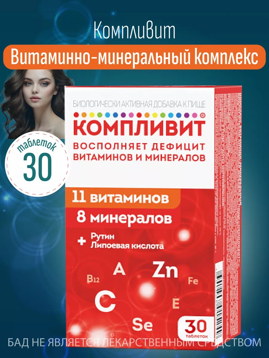 Компливит - биологически активная добавка к пище, представленная в форме таблеток с покрытием из пленочной оболочки. Каждая таблетка содержит массу 890 мг и пригодна для употребления внутрь. Добавка создана для поддержки общего здоровья организма и содержит комплекс важных витаминов и минералов. В состав продукта входит бета-каротин, витамины С, Е, В₁, В₂, В₆, В₁₂, никотинамид, фолиевая кислота, кальций, железо, магний, медь, цинк, йод, селен и другие элементы. Компливит рекомендуется в качестве дополнительного источника витаминов и минералов для людей, желающих поддерживать свое здоровье в хорошей форме.
