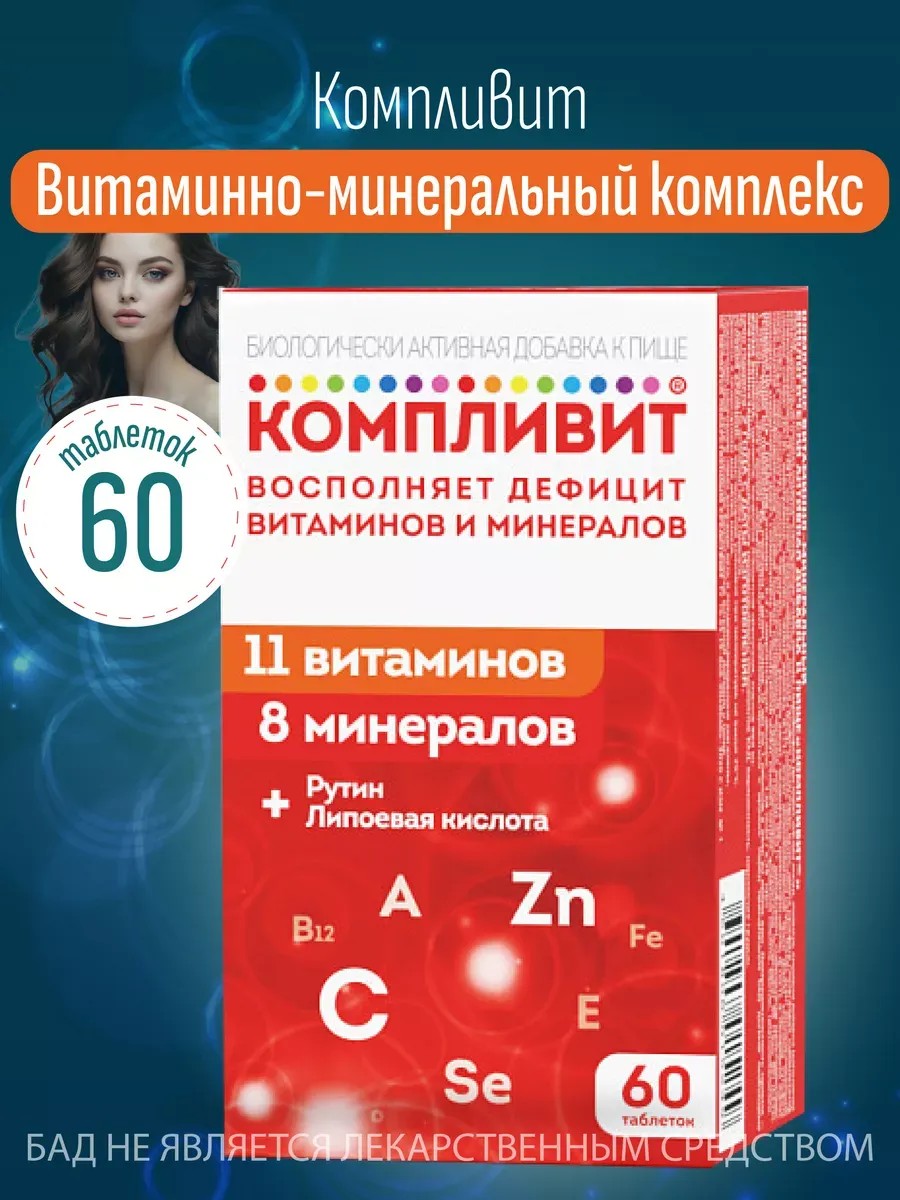 Биологически активная добавка к пище, представленная в форме таблеток с покрытием из пленочной оболочки. Каждая таблетка содержит массу 890 мг и пригодна для употребления внутрь. Добавка создана для поддержки общего здоровья организма и содержит комплекс важных витаминов и минералов. В состав продукта входит бета-каротин, витамины С, Е, В₁, В₂, В₆, В₁₂, никотинамид, фолиевая кислота, кальций, железо, магний, медь, цинк, йод, селен и другие элементы. Компливит рекомендуется в качестве дополнительного источника витаминов и минералов для людей, желающих поддерживать свое здоровье в хорошей форме.Способ применения и дозы:Взрослым и детям старше 15 лет по 1 таблетке в день во время еды. Продолжительность приема - 1 месяц.