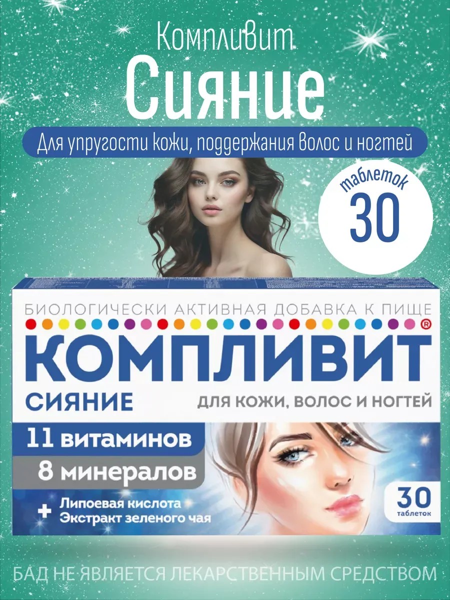 «Компливит Сияние» — комплекс витаминов, минералов, витаминоподобных веществ и экстракта зелёного чая. Предназначен для улучшения состояния кожи, ногтей и волос, особенно в условиях неблагоприятной городской экологии.