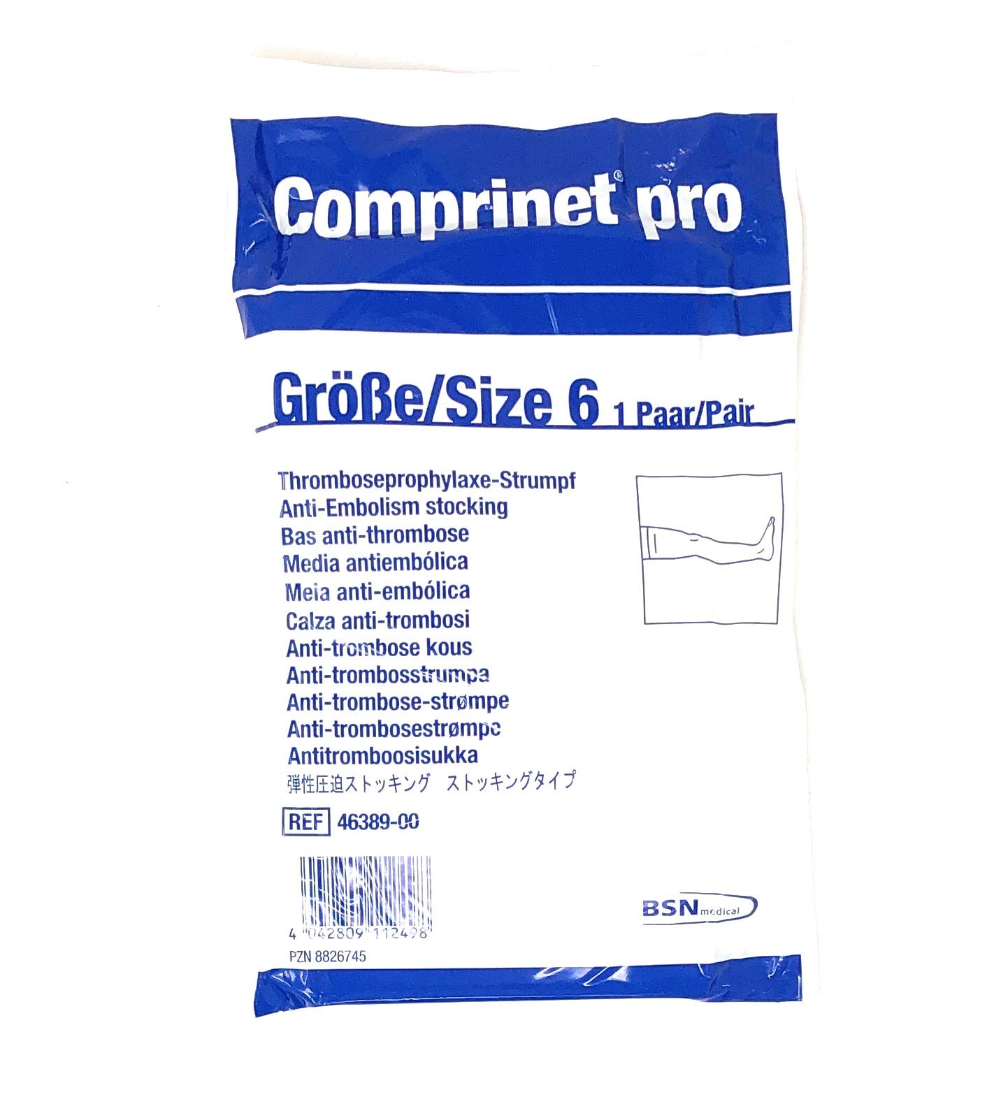 Anti-Thrombose-Strumpf Comprinet Pro Gr. 6. Zweizuggestrick mit weichem textilem Griff. Unter Klinikbedingungen und Beibehaltung des Druckprofils mehrfach waschbar. Strapazierfähig. Verfügt über ein Zehensichtfenster an der Fußoberseite sowie über eine Pendelferse. Anatomische Passform. Passt sich unter Beibehaltung des Druckprofils auch stark konturierten Beinen an. Nahtlos. Ohne Dehnungsreserve. Hautfreundliches, luftdurchlässiges Gewebe. Hautfreundliches Haftband. Größenerkennung durch Farbkennzeichnung nur am Zehensichtfenster. Der Druck fällt von distal nach proximal linear ab. Der Kompressionsdruck beträgt im Fesselbereich ca. 18 mmHg. Gr. 6 - Länge: lang, Weite: groß, Wadenumfang: 38 - 46 cm, Beinlänge: 80 - 97 cm. 1 Paar.
