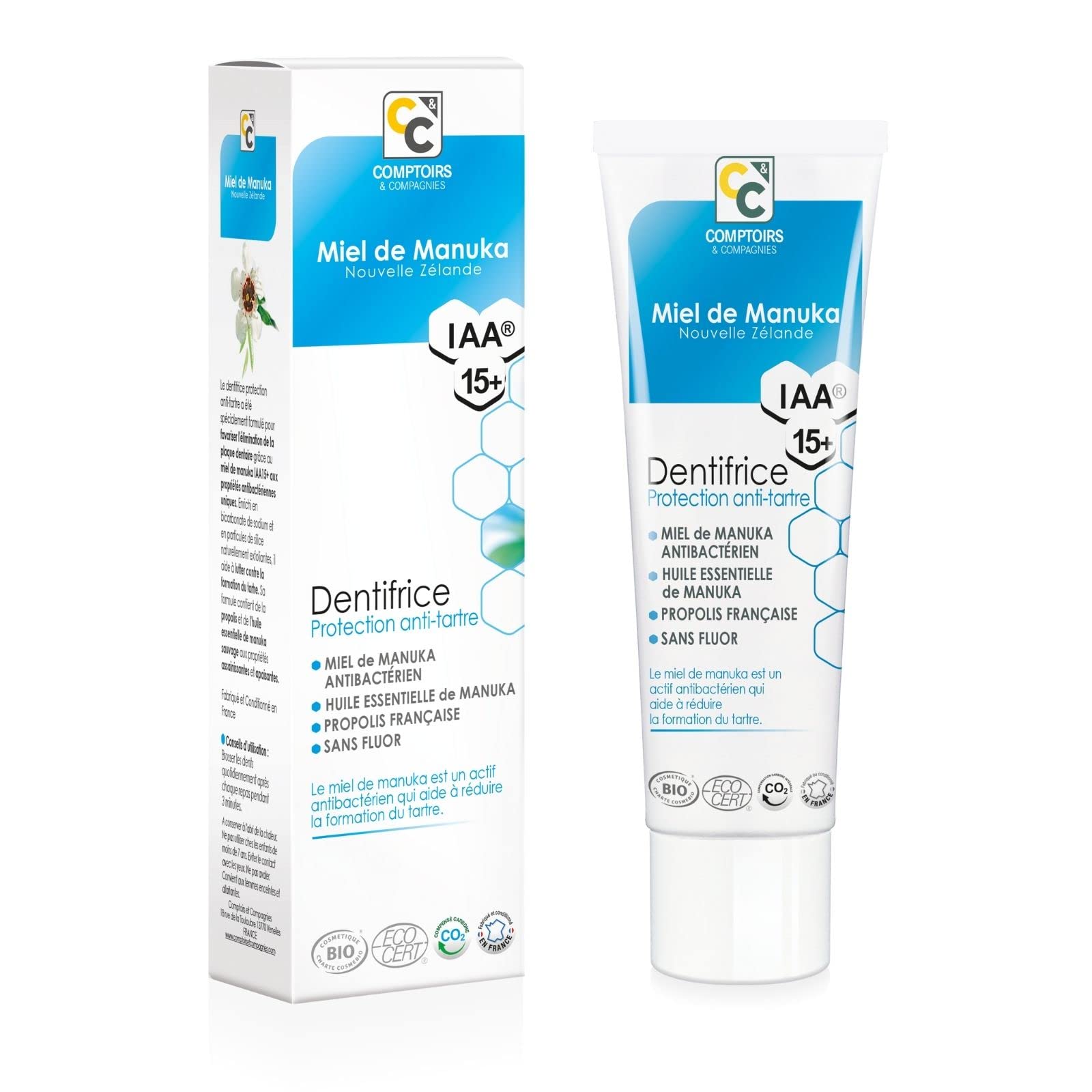 Discover our anti-tartar toothpaste with a unique formula: IAA15 Manuka honey, French organic propolis and Manuka essential oil with protective, cleansing and soothing properties to effectively eliminate dental plaque. Certified organic by Ecocert and labeled Cosmebio, this toothpaste is formulated without fluoride in order to provide complete care for the teeth. Used for centuries by the Maori people in New Zealand, Manuka today offers us its properties in a honey unique in the world. Manuka is one of the most active plants in traditional pharmacopoeia. The IAA index gives you the guarantee of a unique, scientifically proven activity, which is found in our cosmetics. The higher the index, the greater the activity of Manuka honey. Our Manuka honey is harvested by New Zealand beekeepers with whom we have been in close partnership for over 10 years. The non-peroxidic activity of each honey is tested in independent laboratories to guarantee the authenticity of the honey. At Comptoirs et Compagnies, we know our products, we know them perfectly. We live with them, love them and respect them just as we respect those who produce them, who grow them, who harvest them, who package them, who take care of them. They are the ones who are at the center of our approach with each of you. For more than 10 years, Comptoirs et Compagnies has been committed to offering quality products, excellent in taste and with exceptional effectiveness proven by modern science. Our products are carbon offset in order to finance solidarity projects. INGREDIENTS CALCIUM CARBONATE, GLYCERIN, AQUA (WATER), MENTHA PIPERITA (PEPPERMINT) LEAF WATER , SILICA, ALCOHOL , LAURYL GLUCOSIDE, MEL (MANUKA HONEY IAA15 ), SODIUM BICARBONATE, CHONDRUS CRISPUS (CARRAGEENAN) POWDER, XANTHAN GUM, MARIS SAL, EUCALYPTUS GLOBULUS LEAF OIL , MENTHA ARVENSIS HERB OIL , CITRIC ACID, ROSMARINUS OFFICINALIS (ROSEMARY) LEAF OIL , CITRUS LIMON PEEL EXTRACT , STEVIOSIDE , SALVIA SCLAREA (CLARY) FLOWER OIL , PROPOLIS CERA WAX, LEPTOSPERMUM SCOPARIUM BRANCH LEAF OIL, LIMONENE, LINALOOL ingredients from organic farming 100 of the total ingredients are of natural origin 13.87 of the total ingredients are from organic farming DIRECTIONS FOR USE Brush teeth daily after each meal for 3 minutes. SAFETY WARNING Do not use in children under 7 years old. Avoid contact with eyes. Do not swallow. MADE IN FRANCE - Our toothpaste is manufactured and packaged in France. Comptoirs et Compagnies implements a carbon contribution for its rare and endemic raw materials from their country of origin in order to finance solidarity projects. CERTIFIED ORGANIC - Our anti-tartar toothpaste is ECOCERT certified organic and COSMEBIO labeled. It is composed of 100 ingredients of natural origin and 13.87 ingredients from Organic Farming. Tested under the supervision of a dentist. FLUORIDE-FREE - Our anti-tartar toothpaste does not contain fluoride. Tested under the supervision of a dentist. UNIQUE FORMULA - Our anti-tartar toothpaste combines the antibacterial properties of IAA15 Manuka honey with the sanitizing properties of French organic propolis, Manuka essential oil and naturally exfoliating silica particles. FIGHTS TARTAR FORMATION - This anti-tartar treatment cleans and promotes the elimination of dental plaque. Enriched with naturally exfoliating molecules, it helps fight tartar formation for clean and smooth teeth. Découvrez notre dentifrice anti-tartre à la formule unique : miel de Manuka IAA15 , propolis bio française et huile essentielle de Manuka aux propriétés protectrices, assainissantes et apaisantes pour éliminer efficacement la plaque dentaire. Certifié bio par Ecocert et labellisé Cosmebio, ce dentifrice est formulé sans fluor afin d'apporter un soin complet aux dents. Utilisé depuis des siècles par les peuples maoris en Nouvelle-Zélande, le Manuka nous offre aujourd'hui ses propriétés dans un miel unique au monde. Le Manuka est l'un des végétaux les plus actifs de la pharmacopée traditionnelle. L'indice IAA vous apporte la garantie d'une activité unique scientifiquement prouvée, que l'on retrouve dans nos cosmétiques. Plus l'indice est élevé, plus l'activité du miel de Manuka est importante. Notre miel de Manuka est récolté par des apiculteurs néo-zélandais avec qui nous sommes en partenariat étroit depuis plus de 10 ans. L'activité non peroxydique de chaque miel est testée auprès de laboratoires indépendants pour vous garantir l'authenticité du miel. Chez Comptoirs et Compagnies, nous connaissons nos produits, nous les connaissons parfaitement. Nous vivons avec eux, les aimons et les respectons tout comme nous respectons ceux qui les produisent, qui les font grandir, qui les récoltent, qui les emballent, qui en prennent soin. Ce sont eux qui sont au centre de notre démarche avec chacun d'entre vous. Depuis plus de 10 ans, Comptoirs et Compagnies a à cœur de proposer des produits de qualité, excellents au goût et à l'efficacité exceptionnelle prouvée par la science moderne. Nos produits sont compensés carbone afin de financer des projets solidaires. INGRÉDIENTS CALCIUM CARBONATE, GLYCERIN, AQUA (WATER), MENTHA PIPERITA (PEPPERMINT) LEAF WATER , SILICA, ALCOHOL , LAURYL GLUCOSIDE, MEL (MIEL DE MANUKA IAA15 ), SODIUM BICARBONATE, CHONDRUS CRISPUS (CARRAGEENAN) POWDER, XANTHAN GUM, MARIS SAL, EUCALYPTUS GLOBULUS LEAF OIL , MENTHA ARVENSIS HERB OIL , CITRIC ACID, ROSMARINUS OFFICINALIS (ROSEMARY) LEAF OIL , CITRUS LIMON PEEL EXTRACT , STEVIOSIDE , SALVIA SCLAREA (CLARY) FLOWER OIL , PROPOLIS CERA WAX, LEPTOSPERMUM SCOPARIUM BRANCH LEAF OIL, LIMONENE, LINALOOL ingrédients issus de l'agriculture biologique 100 du total des ingrédients sont d'origine naturelle 13,87 du total des ingrédients sont issus de l'agriculture biologique MODE D'EMPLOI Brosser les dents quotidiennement après chaque repas pendant 3 minutes. AVERTISSEMENT DE SÛRETÉ Ne pas utiliser chez les enfants de moins de 7 ans. Eviter le contact avec les yeux