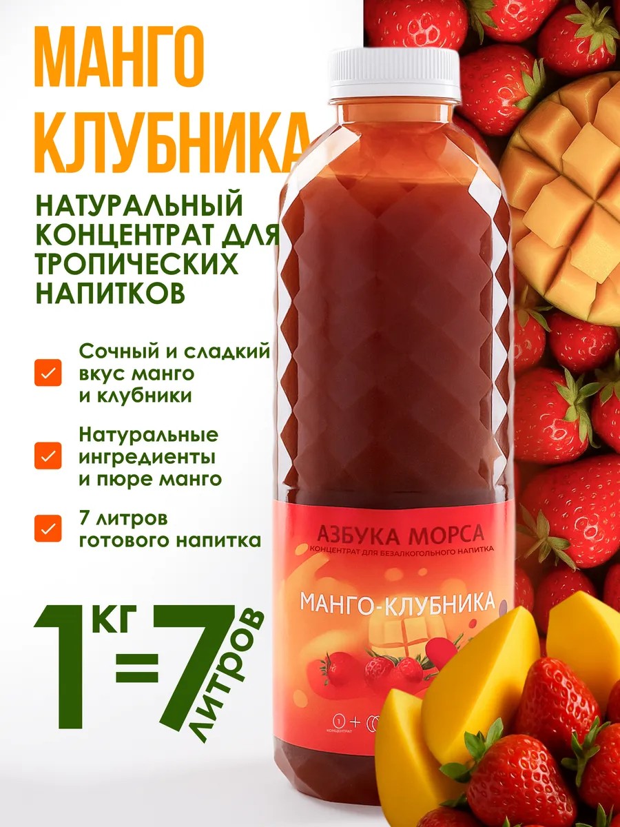 Концентрат "Манго Клубника", 1 кг — это сочная и экзотическая основа для напитков с ярким сочетанием сладкого манго и спелой клубники. Натуральные ингредиенты создают насыщенный тропический вкус, который идеально подойдёт для лимонадов, коктейлей, смузи и других освежающих напитков.
