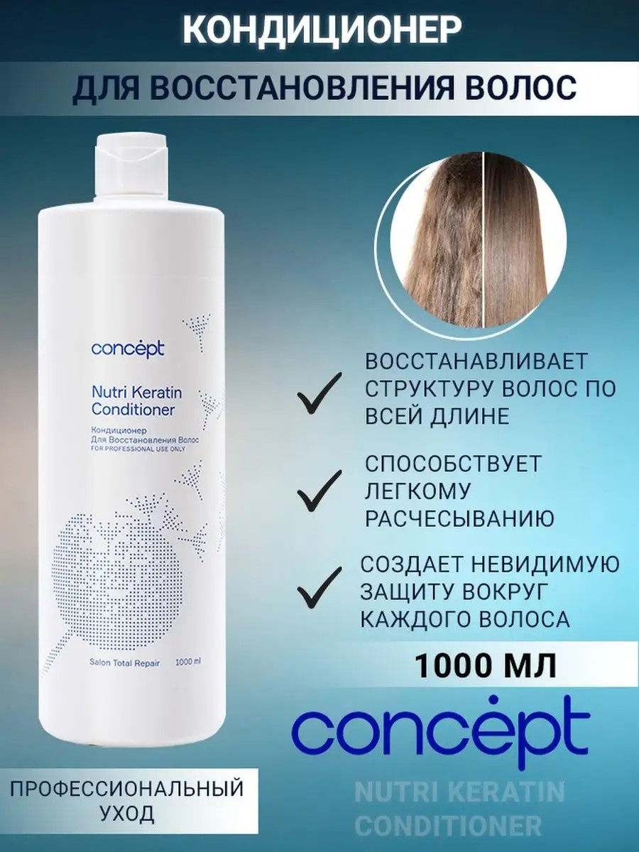 Профессиональный кондиционер концепт, разработанный на основе комплекса Nutri Keratinс мощной восстанавливающей формулой специально для сильно поврежденных волос с секущимися кончиками. Кератиновый комплекс и масло арганы интенсивно питают и реструктурируют волосы изнутри, делая сухие, непослушные, тусклые волосы мягкими и блестящими. Сочетание витаминов E и F в составе обеспечивает волосам дополнительное питание и силу, придает эластичность и укрепляет. D-пантенол создает невидимую защиту вокруг каждого волоса для предотвращения повреждений и ломкости, эффективно увлажняет. Комплекс цитрусовых экстрактов отлично подходит для профилактики сечения кончиков, помогает усилить гладкость и сияющий блеск волос. Слова: профессиональный бальзам для волос безсульфатный кондиционеры женский без сульфатов 1000 мл парабенов увлажняющий косметика набор окрашенных жирных всех типов питательный восстанавливающий кожи головы выпадения кератин роста длинна масла натуральный concept концепт уходовая
