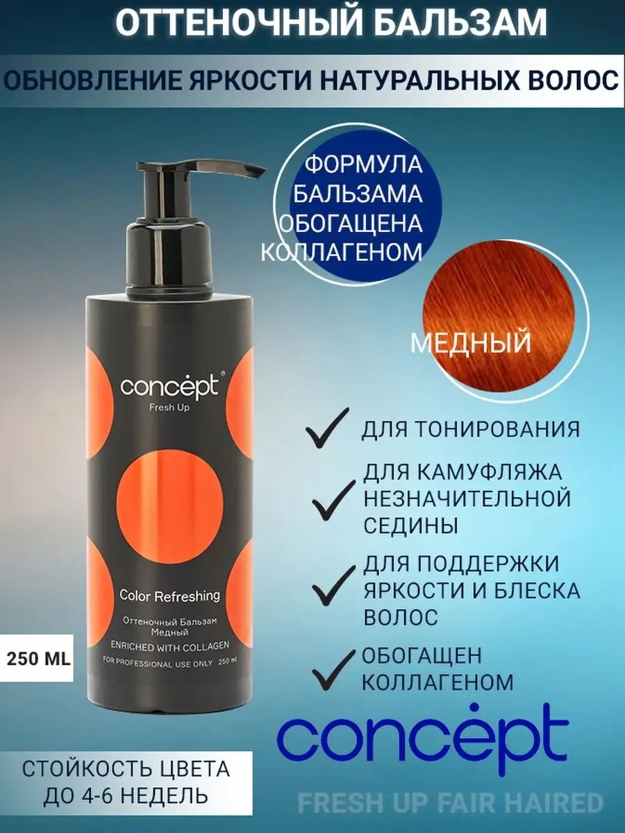 Оттеночный бальзам для волос Concept Fresh Up экстренная помощь вашим волосам. Прямые пигменты Концепт в его составе насыщают цвет, маскируют границу между отросшими и ранее окрашенными волосами. Бальзам мягко воздействует на волосы, не травмирует кожу головы. Обновляет косметический цвет волос, оживляет натуральный. Позволяет быстро подкрасить отросшие корни или спрятать седину. Придает волосам блеск и сияние, делает их более гладкими и шелковистыми, визуально выравнивает поврежденные кончики. Содержит льняное масло, которое интенсивно питает и увлажняет волосы. Не содержит аммиак. Подходит для домашнего и профессионального ухода. Стойкость цвета зависит от состояния волос, времени выдержки и техники тонирования. Для сохранения цвета в дальнейшем рекомендуется использовать продукты Concept для ухода за окрашенными волосами. Слова: волос бальзам оттеночный тоника маска женский профессиональный тонирующая окрашенных тонирования ванной защита пигмент цвета легкое расчесывания красоты блеск действия девушек